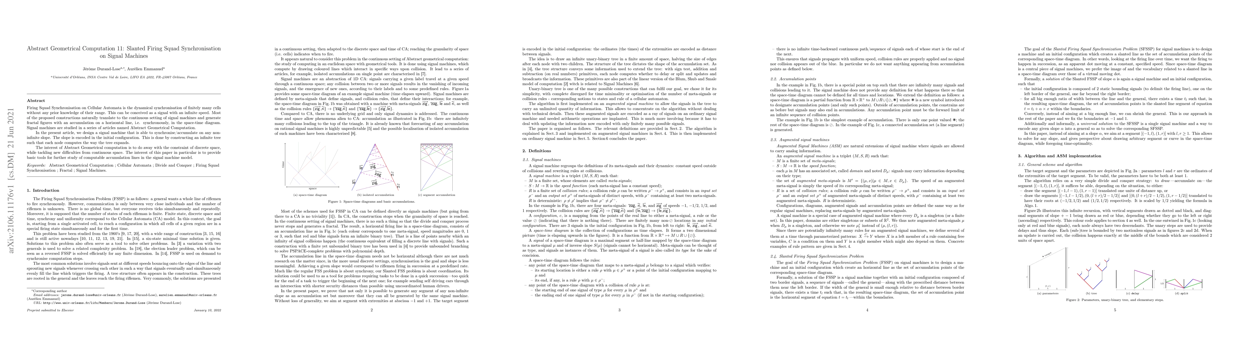 Firing Squad Synchronisation on Cellular Automata is the dynamical synchronisation of finitely many cells without any prior knowledge of their range. This can be conceived as a signal with an infinite speed. Most of the proposed constructions naturally translate to the continuous setting of signal machines and generate fractal figures with an accumulation on a horizontal line, i.e. synchronously, in the space-time diagram. Signal machines are studied in a series of articles named Abstract Geometrical Computation. In the present article, we design a signal machine that is able to synchronise/accumulate on any non-infinite slope. The slope is encoded in the initial configuration. This is done by constructing an infinite tree such that each node computes the way the tree expands. The interest of Abstract Geometrical computation is to do away with the constraint of discrete space, while tackling new difficulties from continuous space. The interest of this paper in particular is to provide basic tools for further study of computable accumulation lines in the signal machine model.