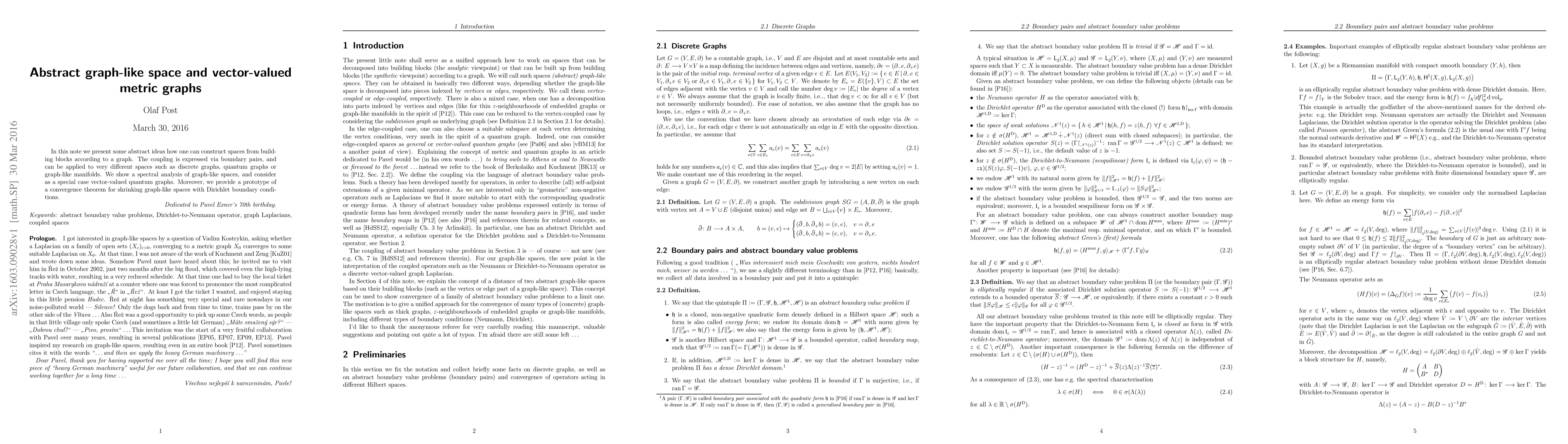 In this note we present some abstract ideas how one can construct spaces from building blocks according to a graph. The coupling is expressed via boundary pairs, and can be applied to very different spaces such as discrete graphs, quantum graphs or graph-like manifolds. We show a spectral analysis of graph-like spaces, and consider as a special case vector-valued quantum graphs. Moreover, we provide a prototype of a convergence theorem for shrinking graph-like spaces with Dirichlet boundary conditions. (Dedicated to Pavel Exner's 70th birthday)