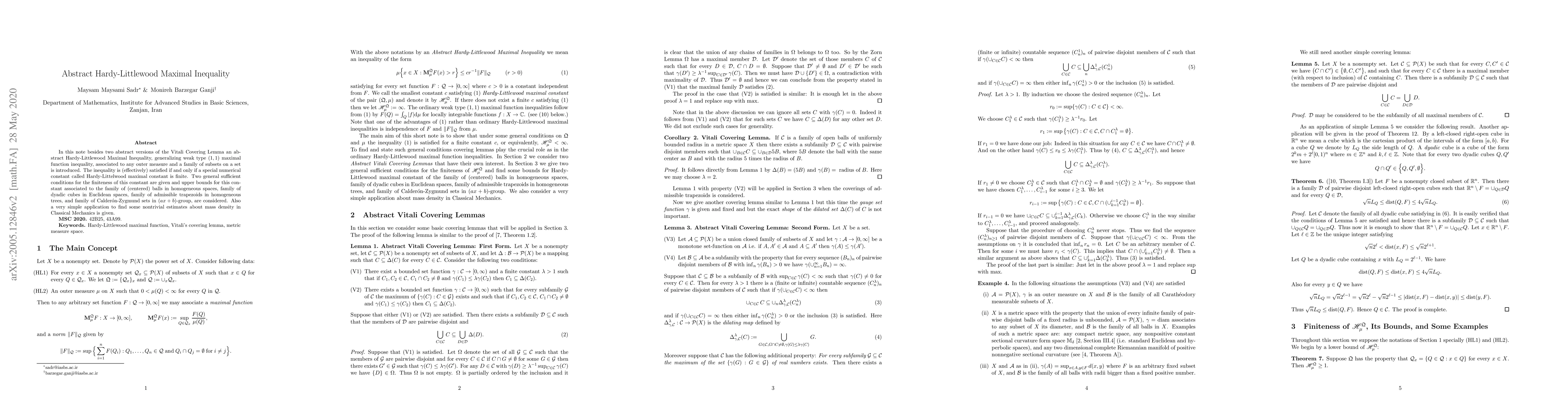 In this note besides two abstract versions of the Vitali Covering Lemma an abstract Hardy-Littlewood Maximal Inequality, generalizing weak type (1,1) maximal function inequality, associated to any outer measure and a family of subsets on a set is introduced. The inequality is (effectively) satisfied if and only if a special numerical constant called Hardy-Littelwood maximal constant is finite. Two general sufficient conditions for the finiteness of this constant are given and upper bounds for this constant associated to the family of (centered) balls in homogeneous spaces, family of dyadic cubes in Euclidean spaces, family of admissible trapezoids in homogeneous trees, and family of Calder\'{o}n-Zygmund sets in (ax+b)-group, are considered. Also a very simple application to find some nontrivial estimates about mass density in Classical Mechanics is given.