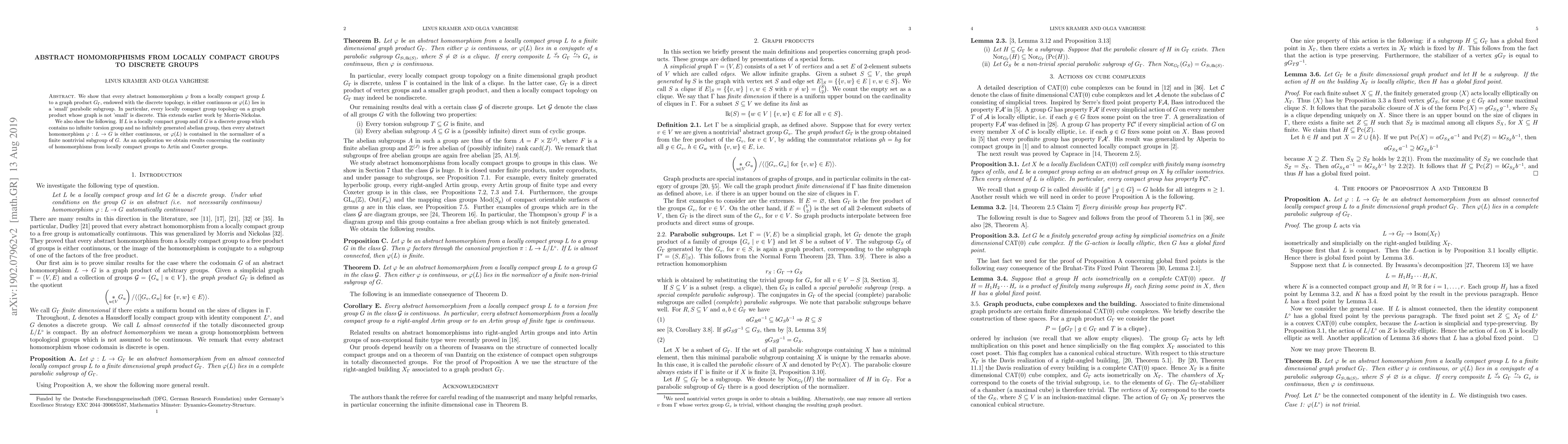 This paper demonstrates that abstract homomorphisms from locally compact groups to discrete groups are either continuous or map to a 'small' subgroup. It extends previous results by showing that certain locally compact group topologies on graph products are discrete, and provides conditions under which homomorphisms to specific discrete groups are continuous or map to normalizers of finite subgroups.