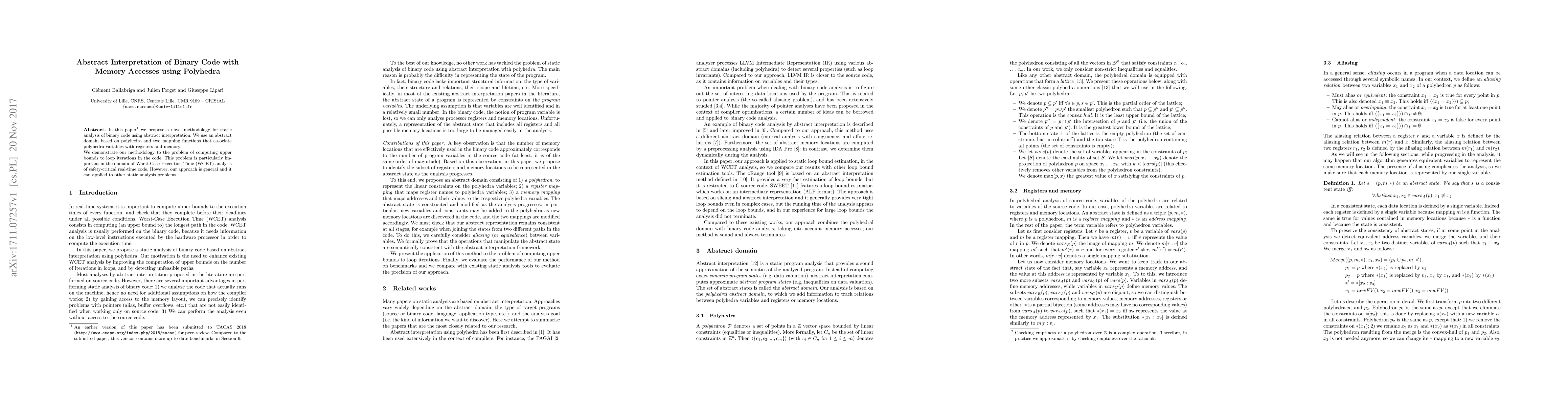 This paper introduces a static analysis methodology for binary code using abstract interpretation with polyhedra to compute upper bounds on loop iterations, crucial for WCET analysis in safety-critical real-time systems. The approach is general and can be applied to various static analysis problems.