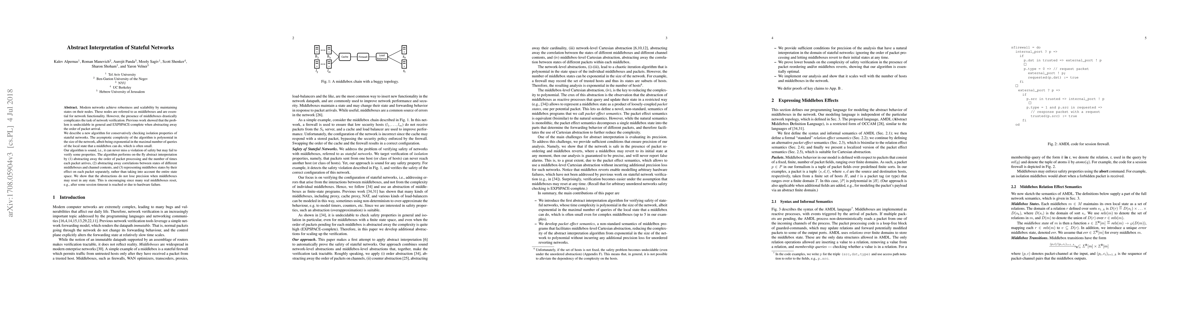 Modern networks achieve robustness and scalability by maintaining states on their nodes. These nodes are referred to as middleboxes and are essential for network functionality. However, the presence of middleboxes drastically complicates the task of network verification. Previous work showed that the problem is undecidable in general and EXPSPACE-complete when abstracting away the order of packet arrival. We describe a new algorithm for conservatively checking isolation properties of stateful networks. The asymptotic complexity of the algorithm is polynomial in the size of the network, albeit being exponential in the maximal number of queries of the local state that a middlebox can do, which is often small. Our algorithm is sound, i.e., it can never miss a violation of safety but may fail to verify some properties. The algorithm performs on-the fly abstract interpretation by (1) abstracting away the order of packet processing and the number of times each packet arrives, (2) abstracting away correlations between states of different middleboxes and channel contents, and (3) representing middlebox states by their effect on each packet separately, rather than taking into account the entire state space. We show that the abstractions do not lose precision when middleboxes may reset in any state. This is encouraging since many real middleboxes reset, e.g., after some session timeout is reached or due to hardware failure.