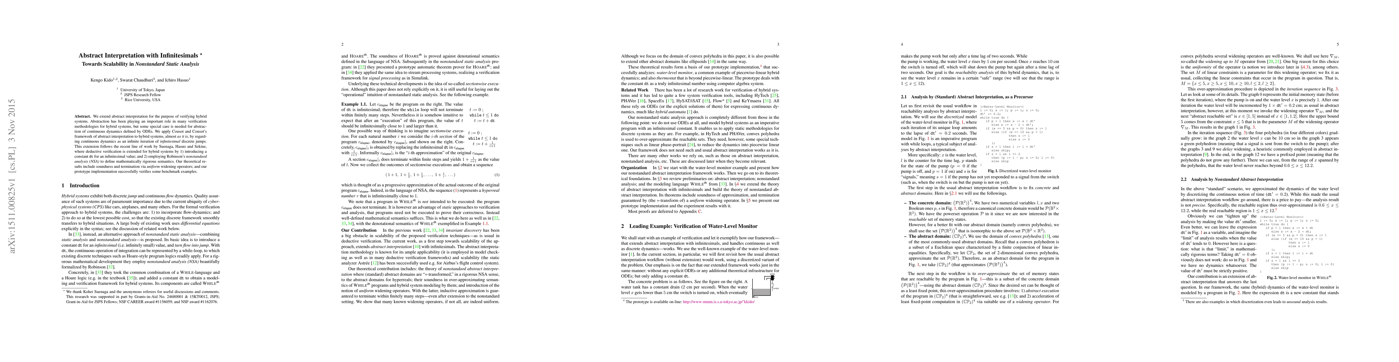 This paper extends abstract interpretation to verify hybrid systems by treating continuous dynamics as infinite iterations of infinitesimal discrete jumps. It employs Robinson's nonstandard analysis to provide mathematically rigorous semantics, achieving soundness and termination through uniform widening operators, and demonstrates effectiveness via a prototype implementation.