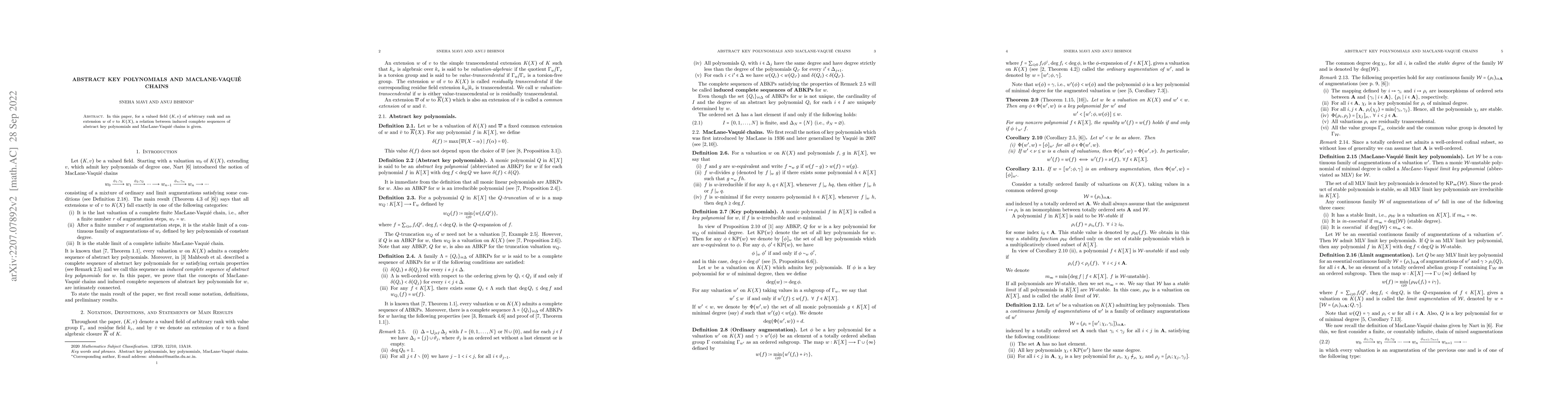In this paper, for a valued field $(K, v)$ of arbitrary rank and an extension $w$ of $v$ to $K(X),$ a relation between induced complete sequences of abstract key polynomials and MacLane-Vaqui\'e chains is given.