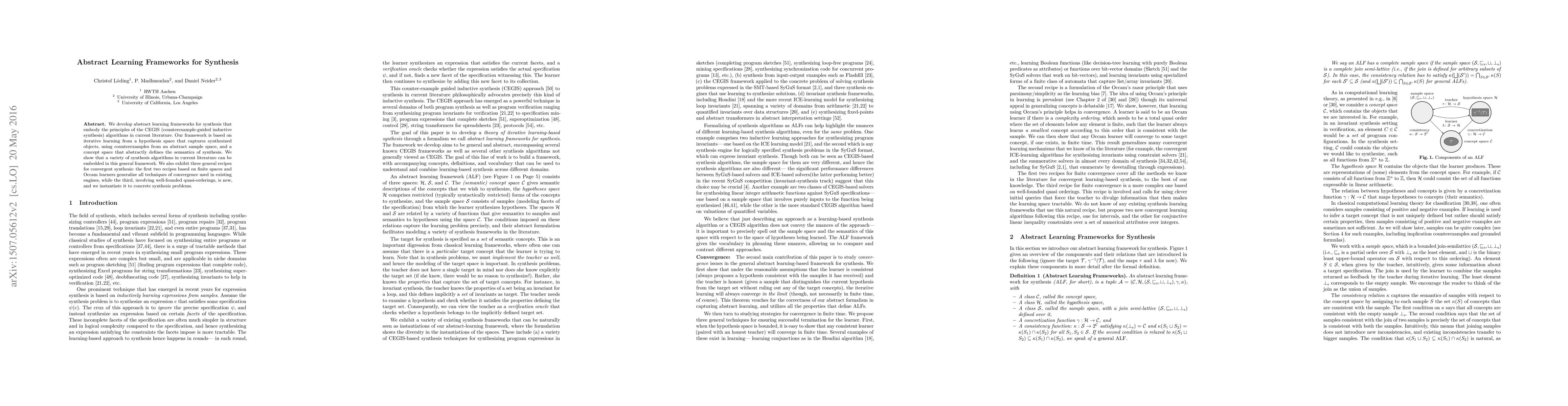 This paper introduces abstract learning frameworks (ALFs) for synthesis based on CEGIS principles, embedding various synthesis algorithms within a general iterative learning model. It also proposes three novel convergence recipes, including a new technique instantiated for specific synthesis problems.
