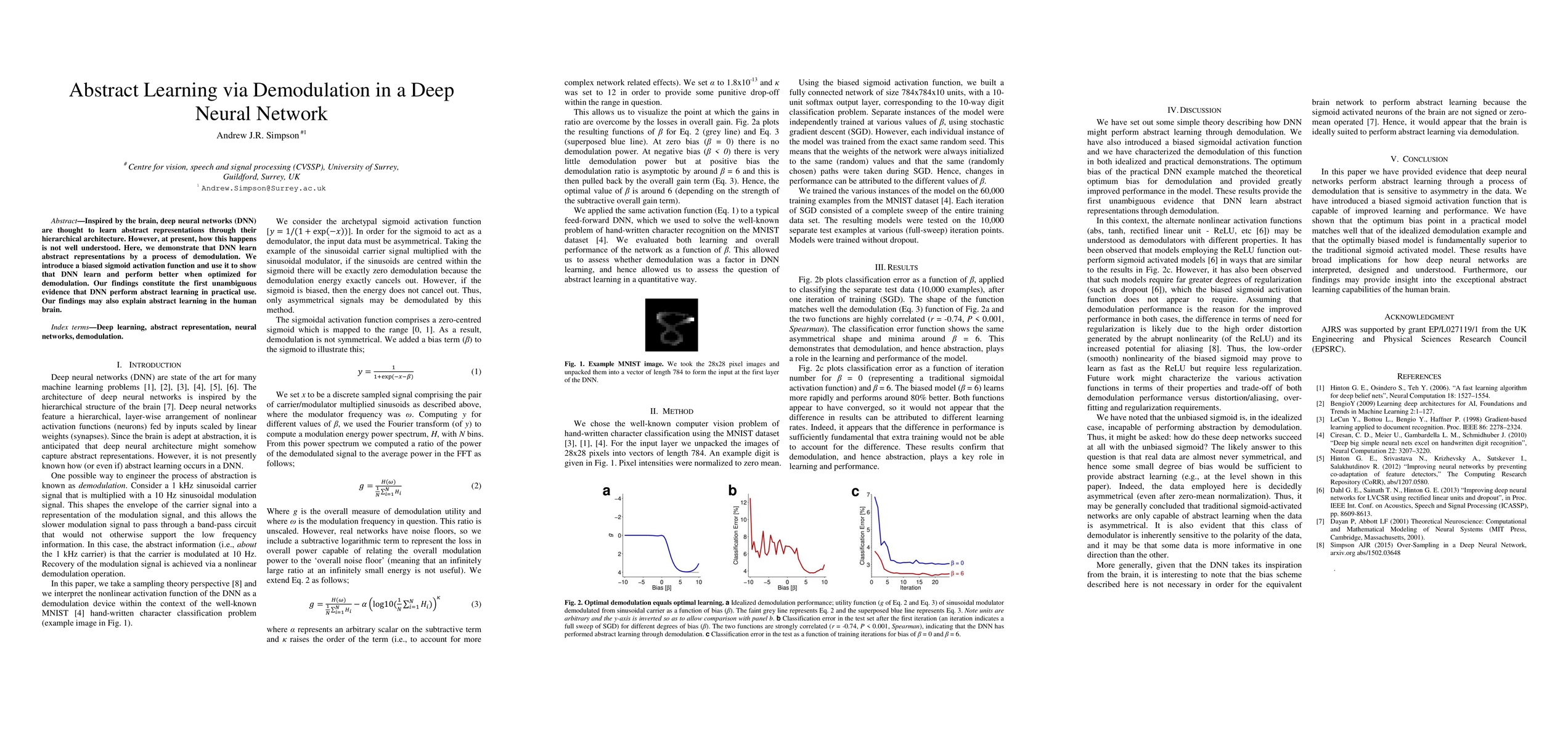 This paper demonstrates that deep neural networks (DNN) learn abstract representations through a process of demodulation, using a biased sigmoid activation function to optimize this learning. The findings provide the first clear evidence of practical abstract learning in DNNs and may offer insights into similar processes in the human brain.