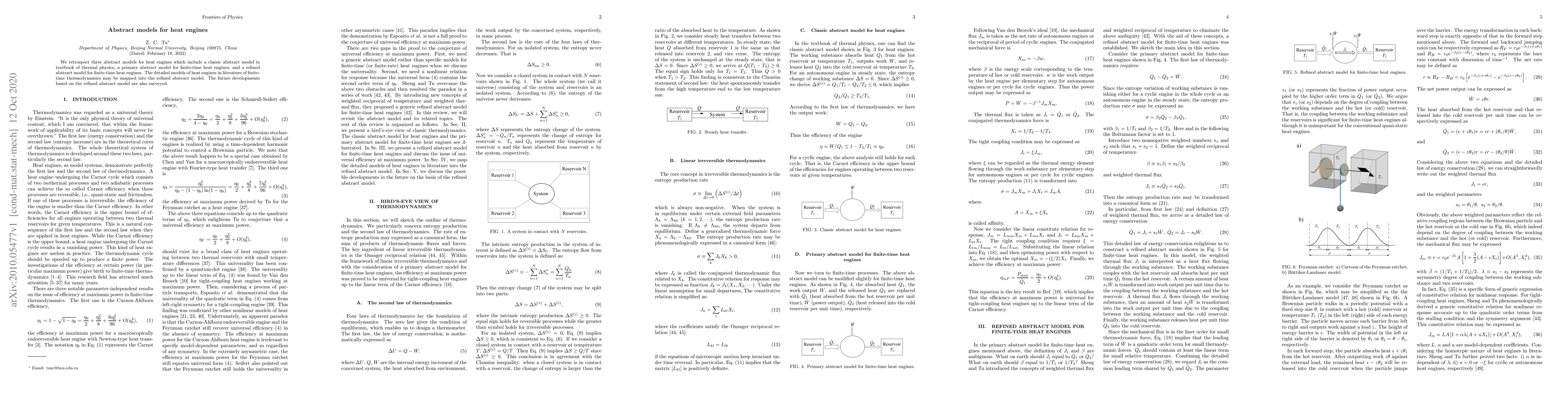 This paper reviews three abstract models for heat engines, including a classic textbook model, a primary finite-time model, and a refined finite-time model. It discusses how existing literature models can be mapped into the refined model and surveys future development prospects based on this refined approach.