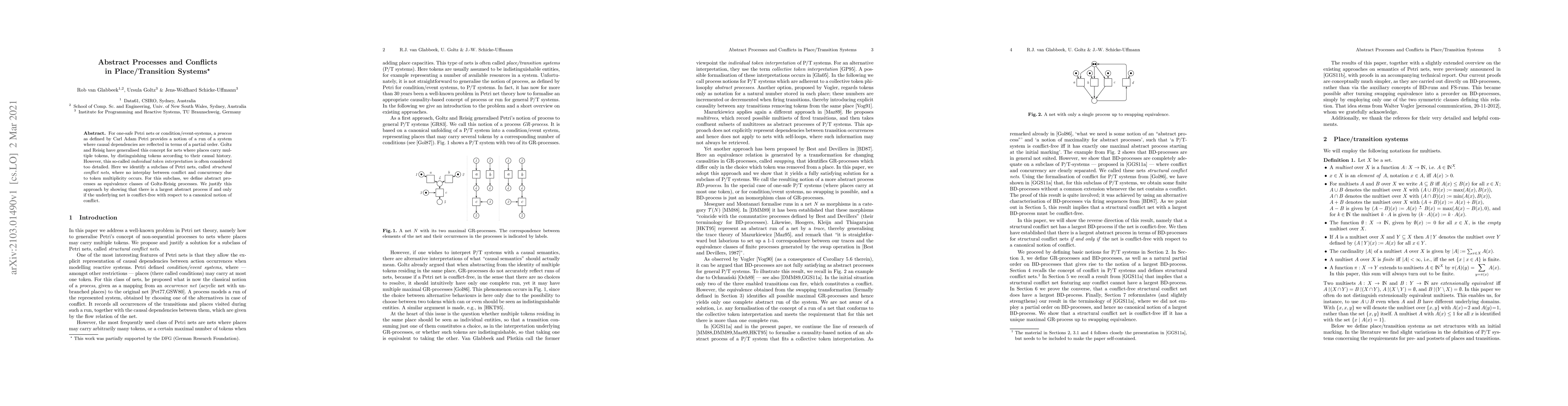 For one-safe Petri nets or condition/event-systems, a process as defined by Carl Adam Petri provides a notion of a run of a system where causal dependencies are reflected in terms of a partial order. Goltz and Reisig have generalised this concept for nets where places carry multiple tokens, by distinguishing tokens according to their causal history. However, this so-called individual token interpretation is often considered too detailed. Here we identify a subclass of Petri nets, called structural conflict nets, where no interplay between conflict and concurrency due to token multiplicity occurs. For this subclass, we define abstract processes as equivalence classes of Goltz-Reisig processes. We justify this approach by showing that there is a largest abstract process if and only if the underlying net is conflict-free with respect to a canonical notion of conflict.
