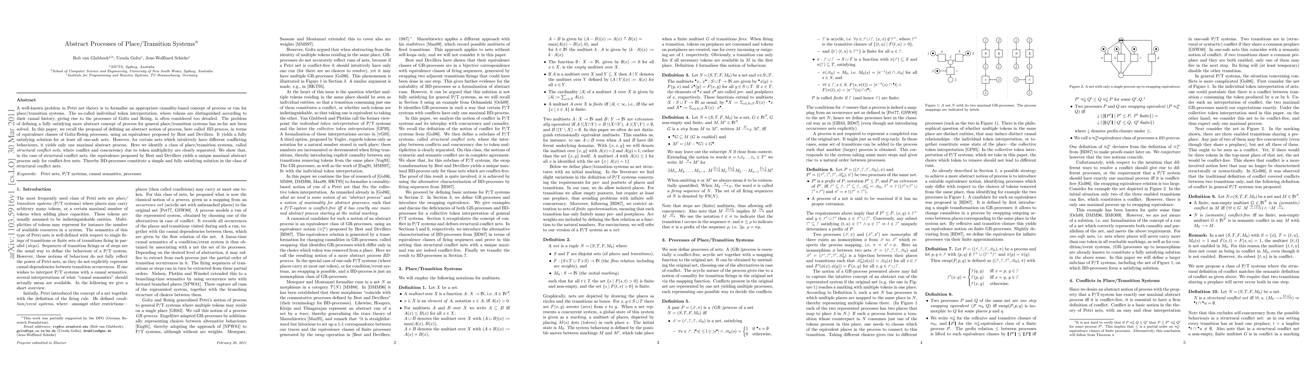 A well-known problem in Petri net theory is to formalise an appropriate causality-based concept of process or run for place/transition systems. The so-called individual token interpretation, where tokens are distinguished according to their causal history, giving rise to the processes of Goltz and Reisig, is often considered too detailed. The problem of defining a fully satisfying more abstract concept of process for general place/transition systems has so-far not been solved. In this paper, we recall the proposal of defining an abstract notion of process, here called BD-process, in terms of equivalence classes of Goltz-Reisig processes, using an equivalence proposed by Best and Devillers. It yields a fully satisfying solution for at least all one-safe nets. However, for certain nets which intuitively have different conflicting behaviours, it yields only one maximal abstract process. Here we identify a class of place/transition systems, called structural conflict nets, where conflict and concurrency due to token multiplicity are clearly separated. We show that, in the case of structural conflict nets, the equivalence proposed by Best and Devillers yields a unique maximal abstract process only for conflict-free nets. Thereby BD-processes constitute a simple and fully satisfying solution in the class of structural conflict nets.