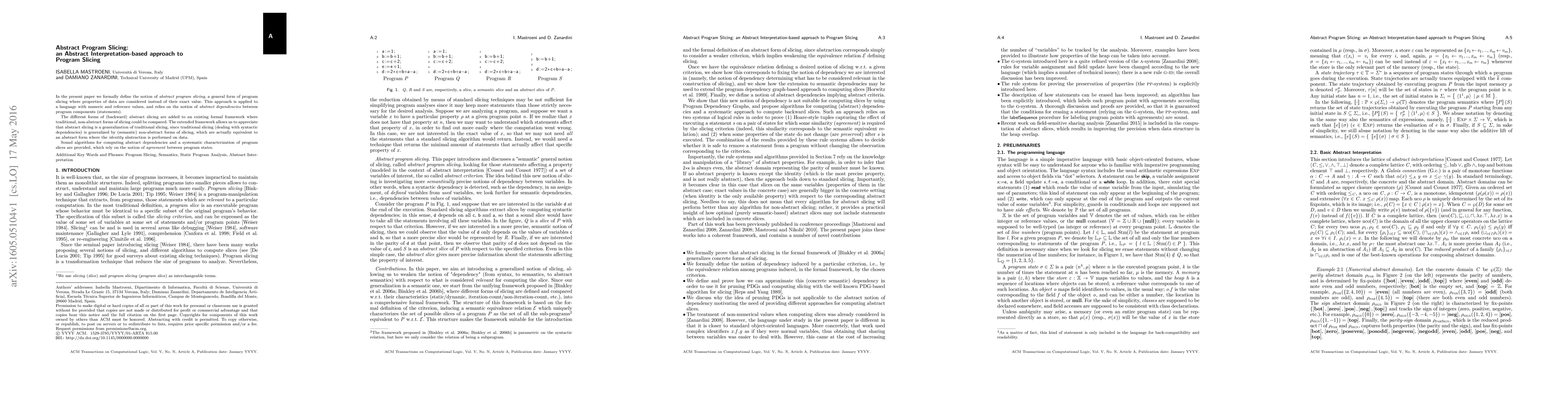 This paper introduces abstract program slicing, a method that considers data properties rather than exact values, extending traditional slicing. It provides sound algorithms for computing abstract dependencies and characterizes program slices based on agreement between program states.
