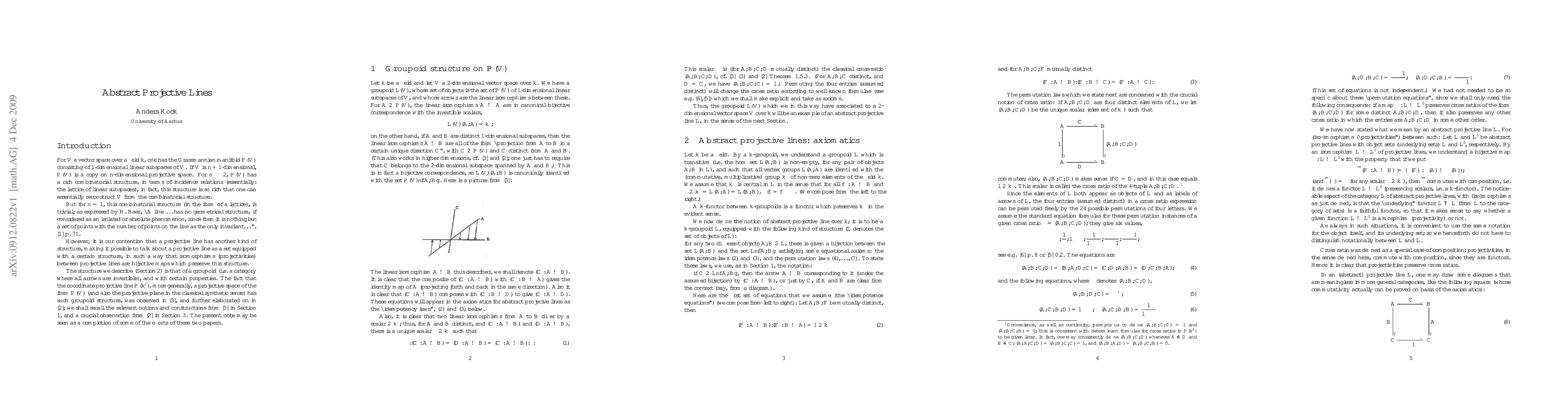 We describe a notion of (abstract) projective line over a field as a set equipped with a certain first order structure, and a projectivity between projective lines as a bijection preserving this structure. The structure in question is that of a groupoid, with certain properties. This leads to a natural notion of bundle of projective lines, forming a stack.
