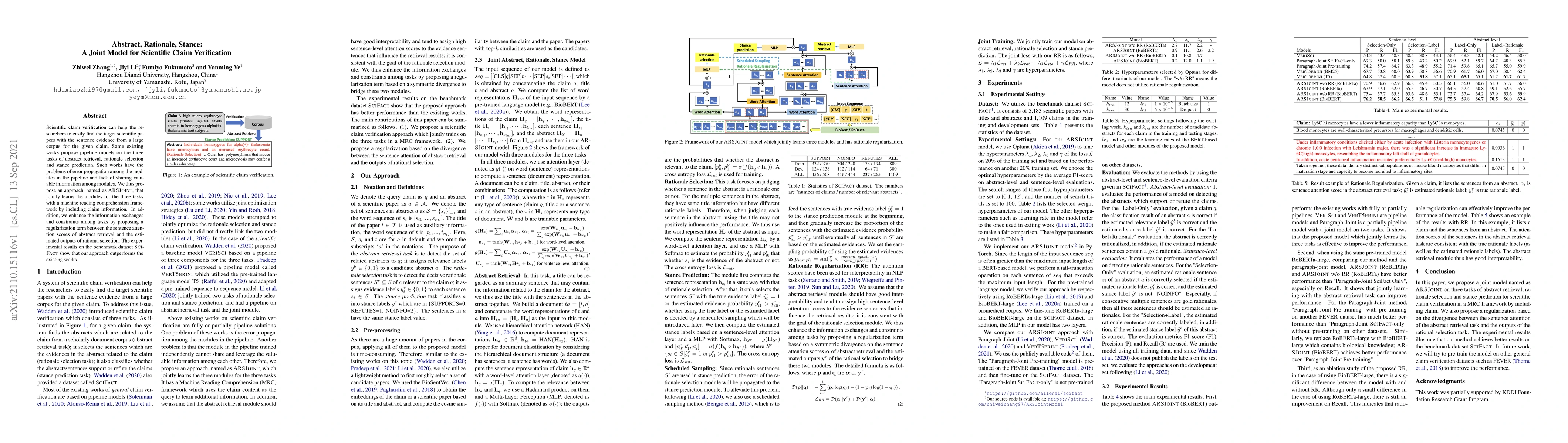 This paper proposes ARSJoint, a joint model to simultaneously perform abstract retrieval, rationale selection, and stance prediction for scientific claim verification, addressing error propagation and information sharing issues in existing pipeline models. Experimental results on SciFact show superior performance compared to prior works.