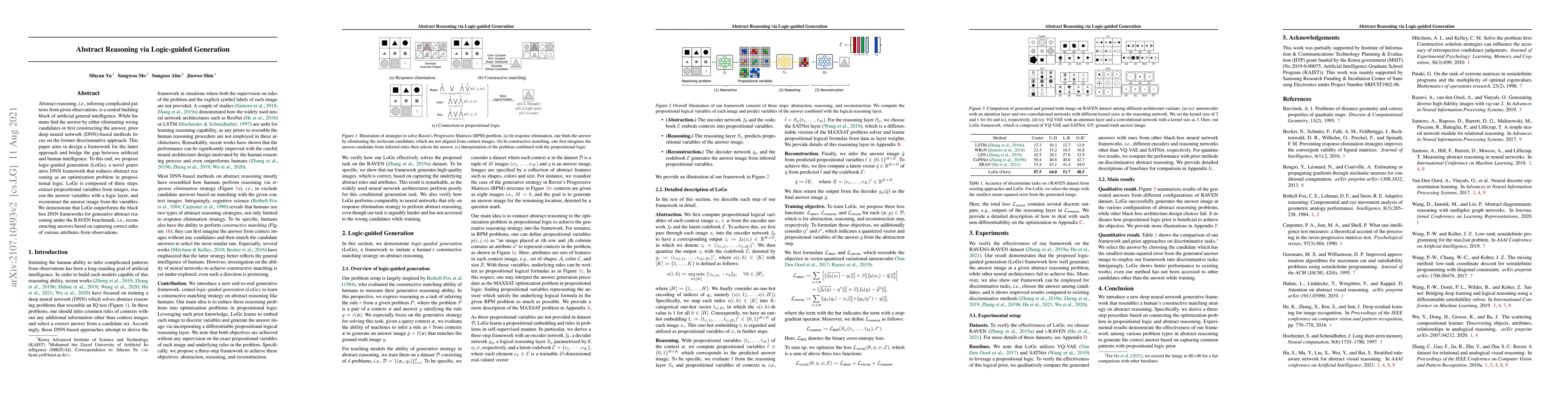 Abstract reasoning, i.e., inferring complicated patterns from given observations, is a central building block of artificial general intelligence. While humans find the answer by either eliminating wrong candidates or first constructing the answer, prior deep neural network (DNN)-based methods focus on the former discriminative approach. This paper aims to design a framework for the latter approach and bridge the gap between artificial and human intelligence. To this end, we propose logic-guided generation (LoGe), a novel generative DNN framework that reduces abstract reasoning as an optimization problem in propositional logic. LoGe is composed of three steps: extract propositional variables from images, reason the answer variables with a logic layer, and reconstruct the answer image from the variables. We demonstrate that LoGe outperforms the black box DNN frameworks for generative abstract reasoning under the RAVEN benchmark, i.e., reconstructing answers based on capturing correct rules of various attributes from observations.
