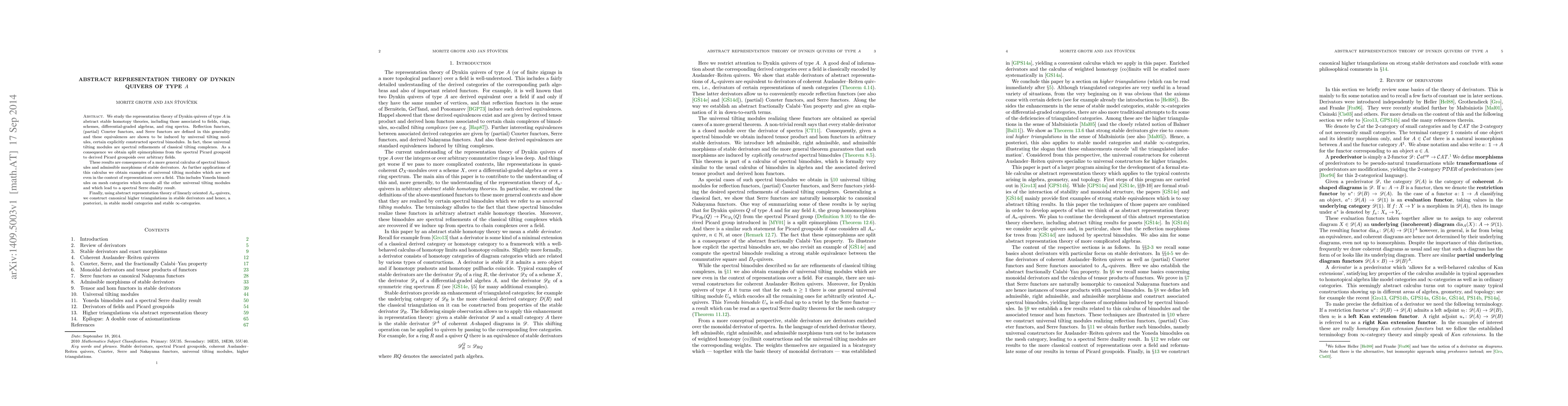We study the representation theory of Dynkin quivers of type A in abstract stable homotopy theories, including those associated to fields, rings, schemes, differential-graded algebras, and ring spectra. Reflection functors, (partial) Coxeter functors, and Serre functors are defined in this generality and these equivalences are shown to be induced by universal tilting modules, certain explicitly constructed spectral bimodules. In fact, these universal tilting modules are spectral refinements of classical tilting complexes. As a consequence we obtain split epimorphisms from the spectral Picard groupoid to derived Picard groupoids over arbitrary fields. These results are consequences of a more general calculus of spectral bimodules and admissible morphisms of stable derivators. As further applications of this calculus we obtain examples of universal tilting modules which are new even in the context of representations over a field. This includes Yoneda bimodules on mesh categories which encode all the other universal tilting modules and which lead to a spectral Serre duality result. Finally, using abstract representation theory of linearly oriented $A_n$-quivers, we construct canonical higher triangulations in stable derivators and hence, a posteriori, in stable model categories and stable $\infty$-categories.