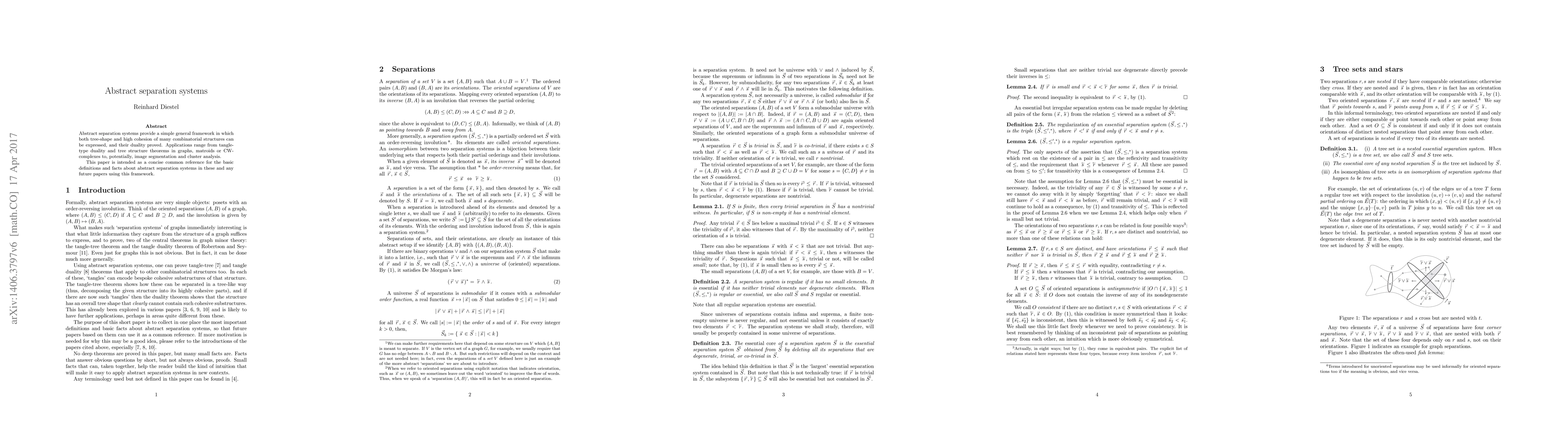 This paper introduces abstract separation systems as a unifying framework for describing combinatorial structures' tree-shape and cohesion, with applications in graph theory, matroids, and potential uses in image segmentation and cluster analysis. It serves as a foundational reference for basic definitions and concepts.