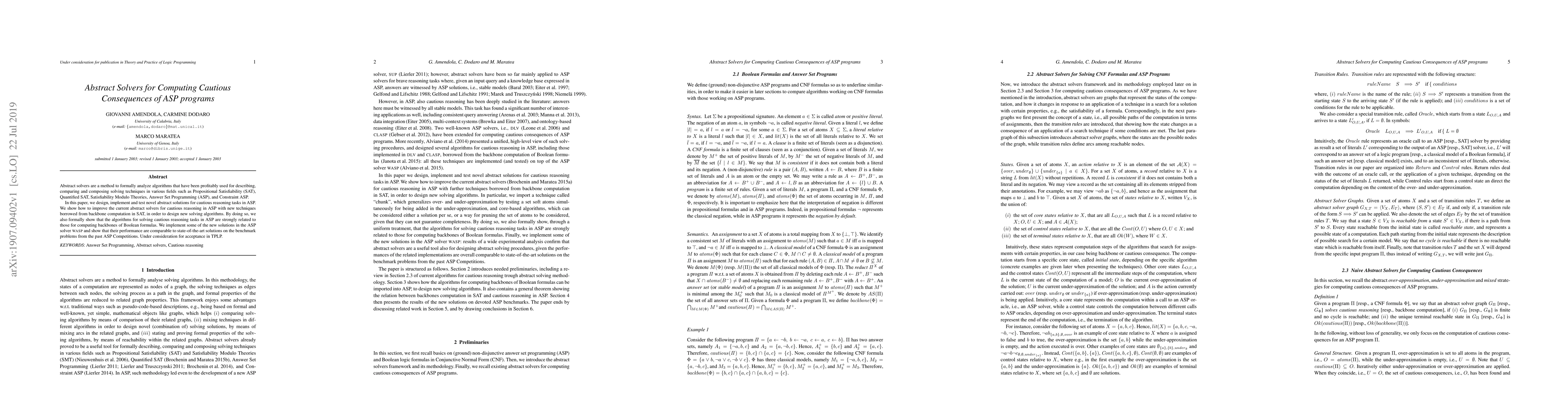 This paper introduces novel abstract solvers for cautious reasoning in Answer Set Programming (ASP) by leveraging techniques from SAT backbone computation. The authors demonstrate improved solving algorithms and show their performance is competitive with state-of-the-art methods on ASP Competition benchmarks.