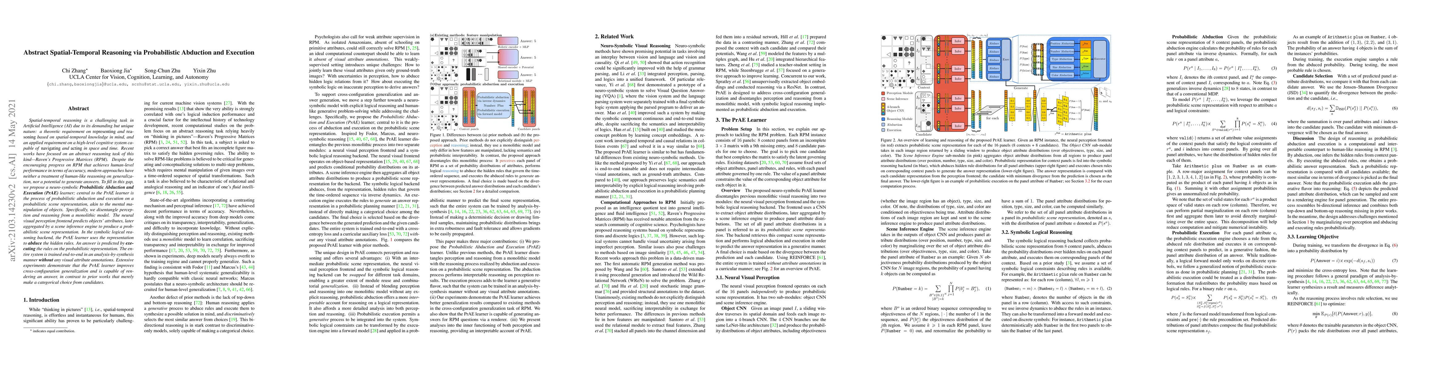 Spatial-temporal reasoning is a challenging task in Artificial Intelligence (AI) due to its demanding but unique nature: a theoretic requirement on representing and reasoning based on spatial-temporal knowledge in mind, and an applied requirement on a high-level cognitive system capable of navigating and acting in space and time. Recent works have focused on an abstract reasoning task of this kind -- Raven's Progressive Matrices (RPM). Despite the encouraging progress on RPM that achieves human-level performance in terms of accuracy, modern approaches have neither a treatment of human-like reasoning on generalization, nor a potential to generate answers. To fill in this gap, we propose a neuro-symbolic Probabilistic Abduction and Execution (PrAE) learner; central to the PrAE learner is the process of probabilistic abduction and execution on a probabilistic scene representation, akin to the mental manipulation of objects. Specifically, we disentangle perception and reasoning from a monolithic model. The neural visual perception frontend predicts objects' attributes, later aggregated by a scene inference engine to produce a probabilistic scene representation. In the symbolic logical reasoning backend, the PrAE learner uses the representation to abduce the hidden rules. An answer is predicted by executing the rules on the probabilistic representation. The entire system is trained end-to-end in an analysis-by-synthesis manner without any visual attribute annotations. Extensive experiments demonstrate that the PrAE learner improves cross-configuration generalization and is capable of rendering an answer, in contrast to prior works that merely make a categorical choice from candidates.