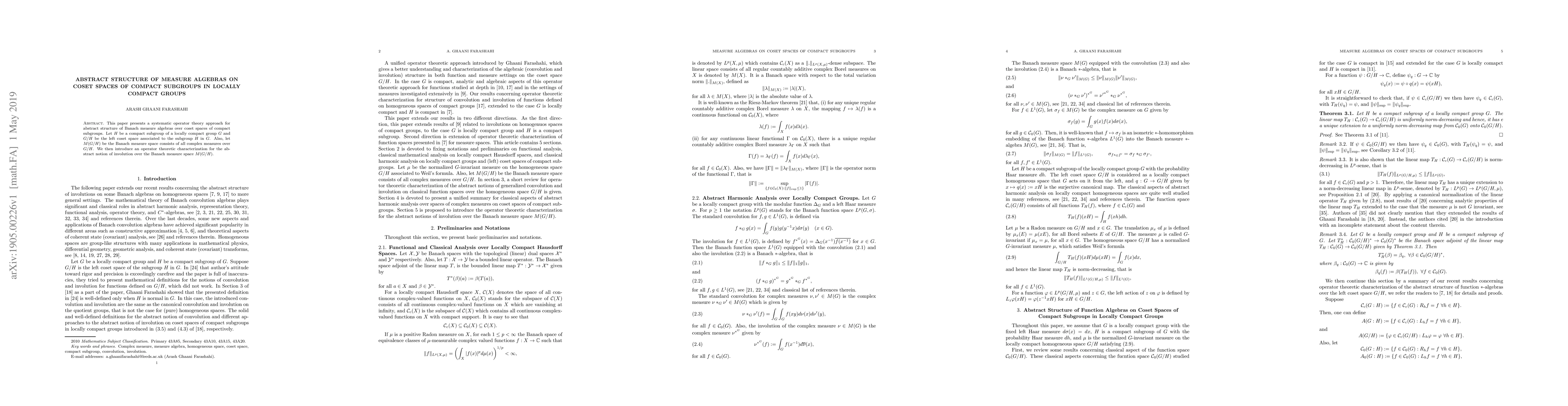 This paper presents a systematic operator theory approach for abstract structure of Banach measure algebras over coset spaces of compact subgroups. Let $H$ be a compact subgroup of a locally compact group $G$ and $G/H$ be the left coset space associated to the subgroup $H$ in $G$. Also, let $M(G/H)$ be the Banach measure space consists of all complex measures over $G/H$. We then introduce an operator theoretic characterization for the abstract notion of involution over the Banach measure space $M(G/H)$.