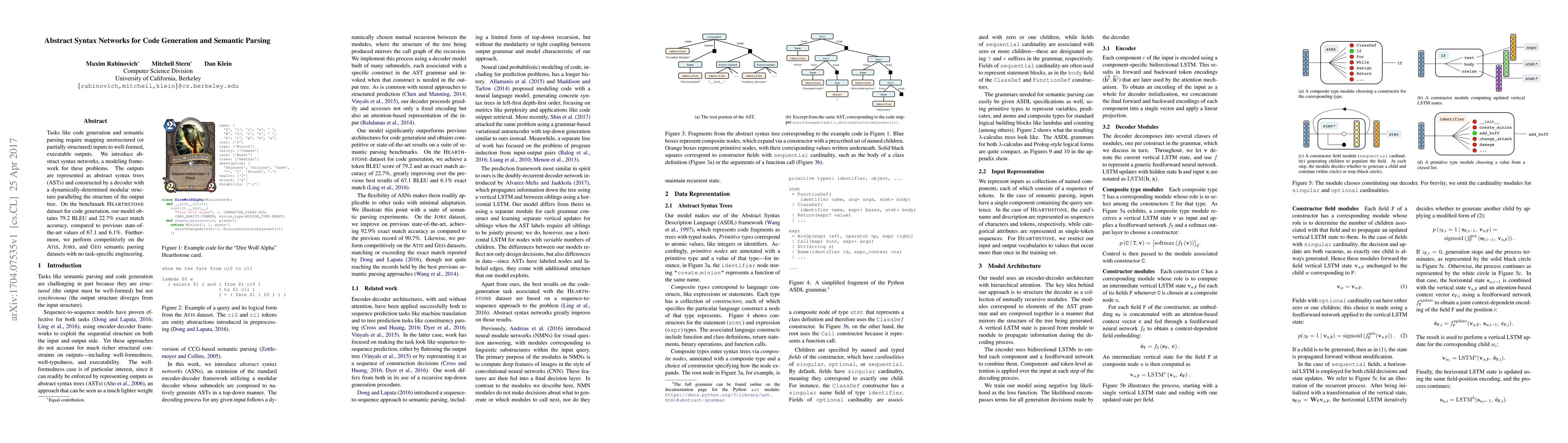 The paper introduces abstract syntax networks to map unstructured inputs to executable outputs via abstract syntax trees, achieving superior performance on code generation and semantic parsing tasks compared to previous methods, particularly on the Hearthstone, Atis, Jobs, and Geo datasets. The model demonstrates notable improvements in BLEU score and exact match accuracy with no task-specific engineering.