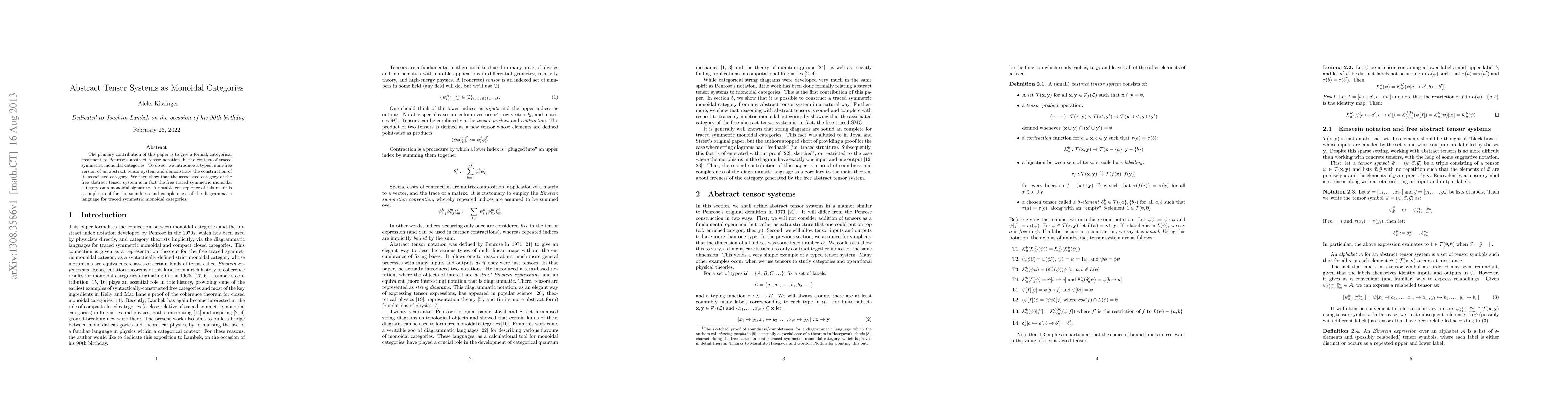 The primary contribution of this paper is to give a formal, categorical treatment to Penrose's abstract tensor notation, in the context of traced symmetric monoidal categories. To do so, we introduce a typed, sum-free version of an abstract tensor system and demonstrate the construction of its associated category. We then show that the associated category of the free abstract tensor system is in fact the free traced symmetric monoidal category on a monoidal signature. A notable consequence of this result is a simple proof for the soundness and completeness of the diagrammatic language for traced symmetric monoidal categories.