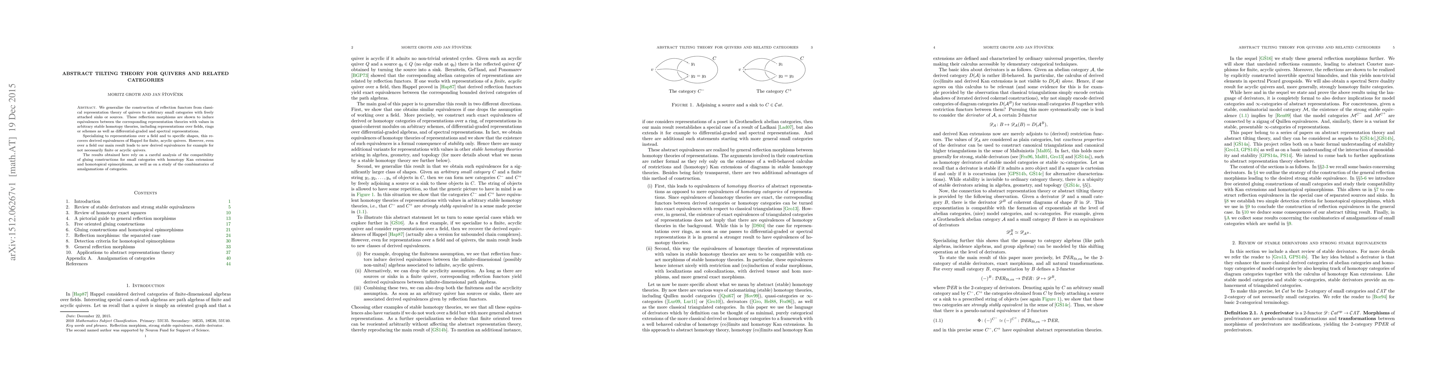 We generalize the construction of reflection functors from classical representation theory of quivers to arbitrary small categories with freely attached sinks or sources. These reflection morphisms are shown to induce equivalences between the corresponding representation theories with values in arbitrary stable homotopy theories, including representations over fields, rings or schemes as well as differential-graded and spectral representations. Specializing to representations over a field and to specific shapes, this recovers derived equivalences of Happel for finite, acyclic quivers. However, even over a field our main result leads to new derived equivalences for example for not necessarily finite or acyclic quivers. The results obtained here rely on a careful analysis of the compatibility of gluing constructions for small categories with homotopy Kan extensions and homotopical epimorphisms, as well as on a study of the combinatorics of amalgamations of categories.