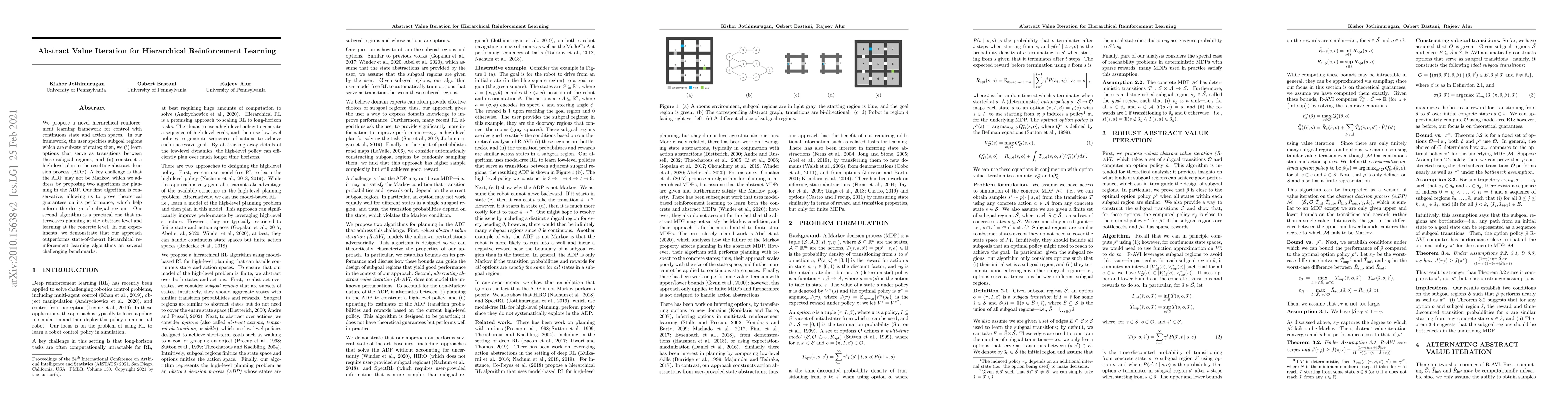 This paper introduces a hierarchical reinforcement learning framework for continuous state and action spaces, defining subgoal regions and learning transitions between them. The authors propose two algorithms for planning in the abstract decision process, one with theoretical guarantees and another that combines abstract and concrete level learning, demonstrating superior performance on benchmarks.