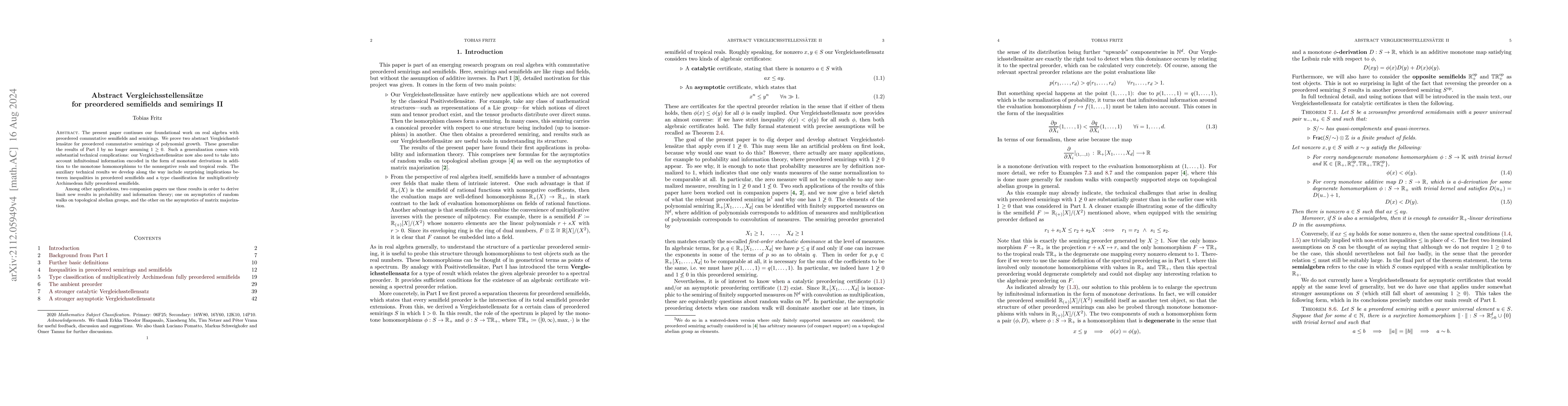 This paper continues our foundational work on real algebra with preordered semifields and semirings. We prove two abstract Vergleichsstellens\"atze for commutative preordered semirings of polynomial growth. These generalize the results of Part I in that we now no longer assume $1 \ge 0$. This adds substantial technical complications: our Vergleichsstellens\"atze now also need to take into account infinitesimal information encoded in the form of monotone derivations in addition to the monotone homomorphisms to the nonnegative reals and tropical reals. The proof relies on a number of technical results that we develop along the way, including surprising implications between inequalities in preordered semifields and a type classification for multiplicatively Archimedean fully preordered semifields. A companion paper uses these results in order to derive a limit theorem for random walks on topological abelian groups which provides sufficient and close to necessary conditions for when one random walk will dominate another at late times.