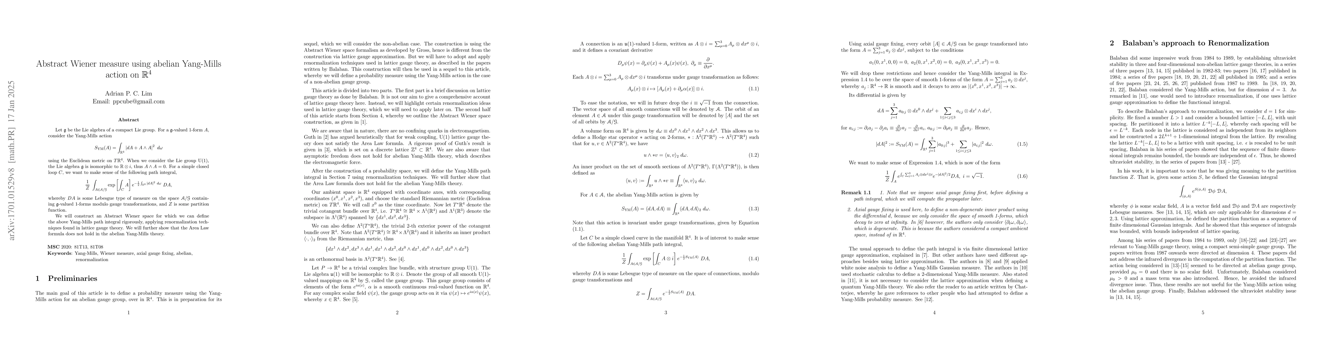 Let $\mathfrak{g}$ be the Lie algebra of a compact Lie group. For a $\mathfrak{g}$-valued 1-form $A$, consider the Yang-Mills action \begin{equation} S_{{\rm YM}}(A) = \int_{\mathbb{R}^4} \left|dA + A \wedge A \right|^2\ d\omega \nonumber \end{equation} using the standard metric on $T\mathbb{R}^4$. When we consider the Lie group ${\rm U}(1)$, the Lie algebra $\mathfrak{g}$ is isomorphic to $\mathbb{R} \otimes i$, thus $A \wedge A = 0$. For some simple closed loop $C$, we want to make sense of the following path integral, \begin{equation} \frac{1}{Z}\ \int_{A \in \mathcal{A} /\mathcal{G}} \exp \left[ \int_{C} A\right] e^{-\frac{1}{2}\int_{\mathbb{R}^4}|dA|^2\ d\omega}\ DA, \nonumber \end{equation} whereby $DA$ is some Lebesgue type of measure on the space of $\mathfrak{g}$-valued 1-forms, modulo gauge transformations, $\mathcal{A} /\mathcal{G}$, and $Z$ is some partition function. We will construct an Abstract Wiener space for which we can define the above Yang-Mills path integral rigorously, using renormalization techniques found in lattice gauge theory. We will further show that the Area Law formula do not hold in the abelian Yang-Mills theory.