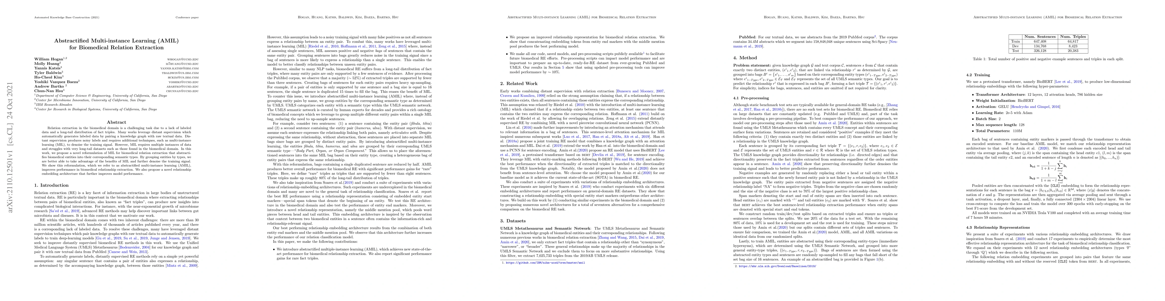 Relation extraction in the biomedical domain is a challenging task due to a lack of labeled data and a long-tail distribution of fact triples. Many works leverage distant supervision which automatically generates labeled data by pairing a knowledge graph with raw textual data. Distant supervision produces noisy labels and requires additional techniques, such as multi-instance learning (MIL), to denoise the training signal. However, MIL requires multiple instances of data and struggles with very long-tail datasets such as those found in the biomedical domain. In this work, we propose a novel reformulation of MIL for biomedical relation extraction that abstractifies biomedical entities into their corresponding semantic types. By grouping entities by types, we are better able to take advantage of the benefits of MIL and further denoise the training signal. We show this reformulation, which we refer to as abstractified multi-instance learning (AMIL), improves performance in biomedical relationship extraction. We also propose a novel relationship embedding architecture that further improves model performance.