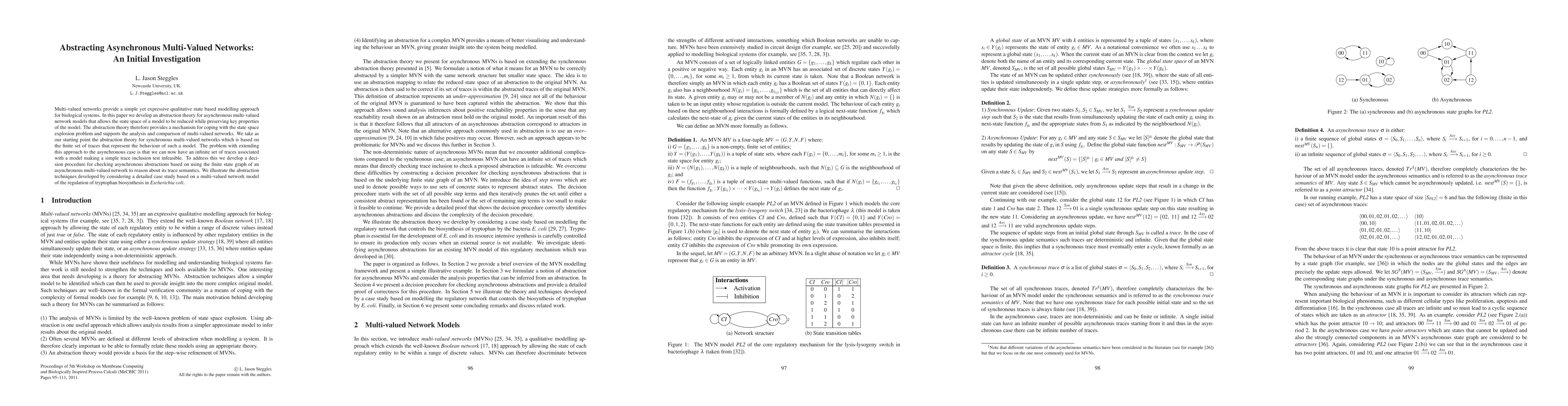 Multi-valued networks provide a simple yet expressive qualitative state based modelling approach for biological systems. In this paper we develop an abstraction theory for asynchronous multi-valued network models that allows the state space of a model to be reduced while preserving key properties of the model. The abstraction theory therefore provides a mechanism for coping with the state space explosion problem and supports the analysis and comparison of multi-valued networks. We take as our starting point the abstraction theory for synchronous multi-valued networks which is based on the finite set of traces that represent the behaviour of such a model. The problem with extending this approach to the asynchronous case is that we can now have an infinite set of traces associated with a model making a simple trace inclusion test infeasible. To address this we develop a decision procedure for checking asynchronous abstractions based on using the finite state graph of an asynchronous multi-valued network to reason about its trace semantics. We illustrate the abstraction techniques developed by considering a detailed case study based on a multi-valued network model of the regulation of tryptophan biosynthesis in Escherichia coli.