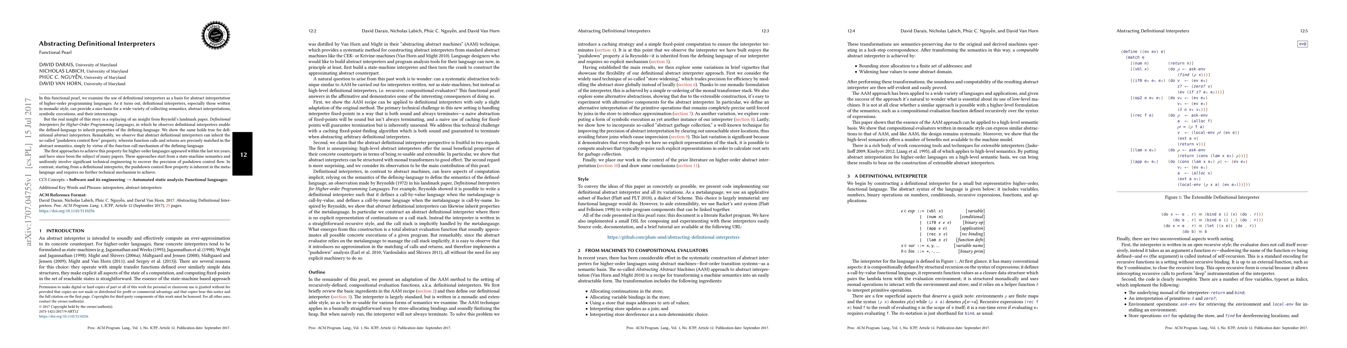 This paper explores how definitional interpreters, particularly monadic ones, serve as a foundation for abstract interpretation of higher-order programming languages, highlighting that they inherently support "pushdown control flow" without additional technical engineering. The authors draw parallels to Reynolds' earlier work, noting that abstract definitional interpreters inherit properties from the defining language naturally.