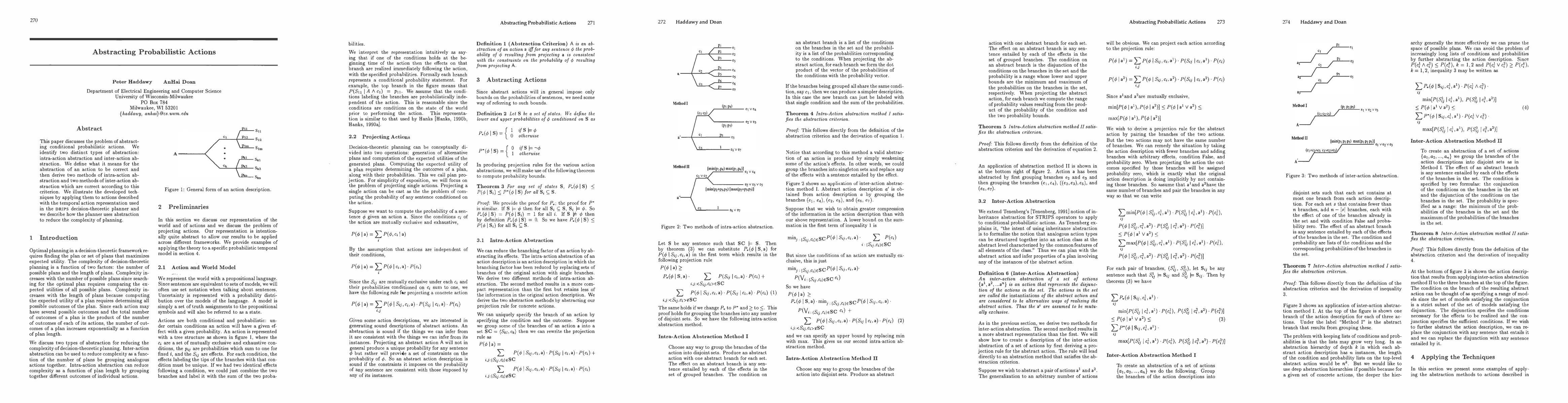 This paper introduces methods for abstracting probabilistic actions, distinguishing between intra-action and inter-action abstraction. It defines correctness for abstraction and presents techniques for both types, demonstrating their application to the DRIPS decision-theoretic planner to reduce planning complexity.