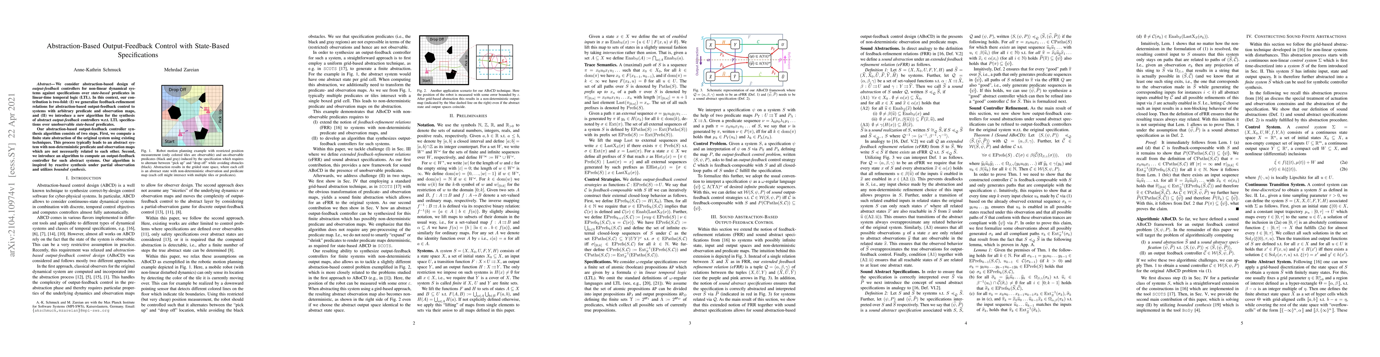This paper presents an abstraction-based method for synthesizing output-feedback controllers for non-linear systems, ensuring compliance with state-based specifications in linear-time temporal logic. The authors generalize feedback-refinement relations and propose a new algorithm for synthesizing abstract controllers under partial observation.