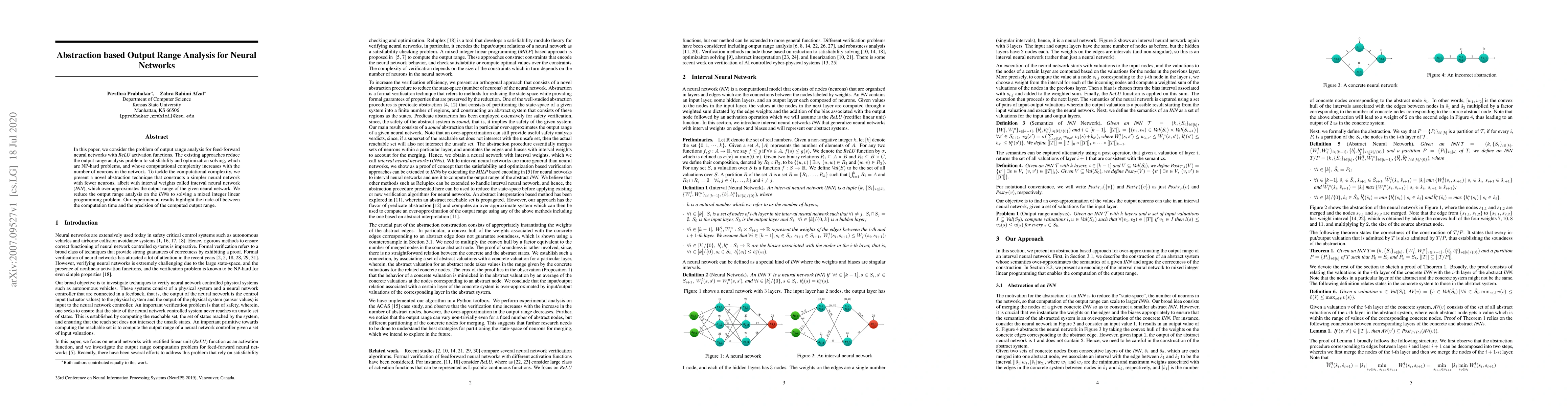 This paper introduces an abstraction technique to simplify output range analysis for feed-forward neural networks with ReLU activations, using an interval neural network (INN) to reduce computational complexity. The method transforms the problem into a mixed integer linear programming problem, balancing computation time and precision.