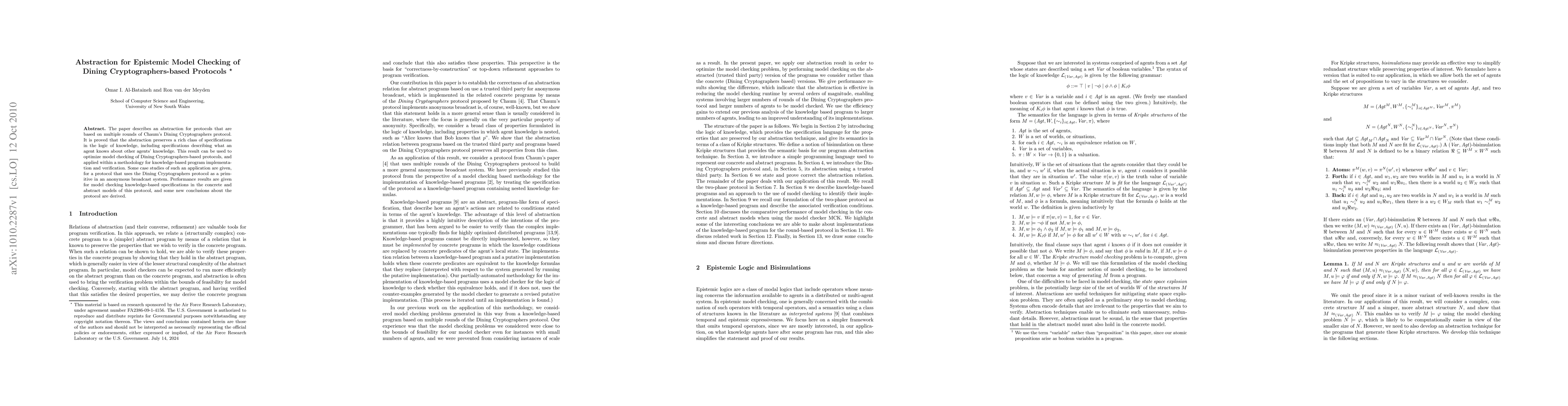 The paper presents an abstraction technique for optimizing the model checking of protocols based on Chaum's Dining Cryptographers, preserving knowledge-based specifications. Performance results show improved efficiency in verifying knowledge-based implementations, with new insights derived from the abstracted model.