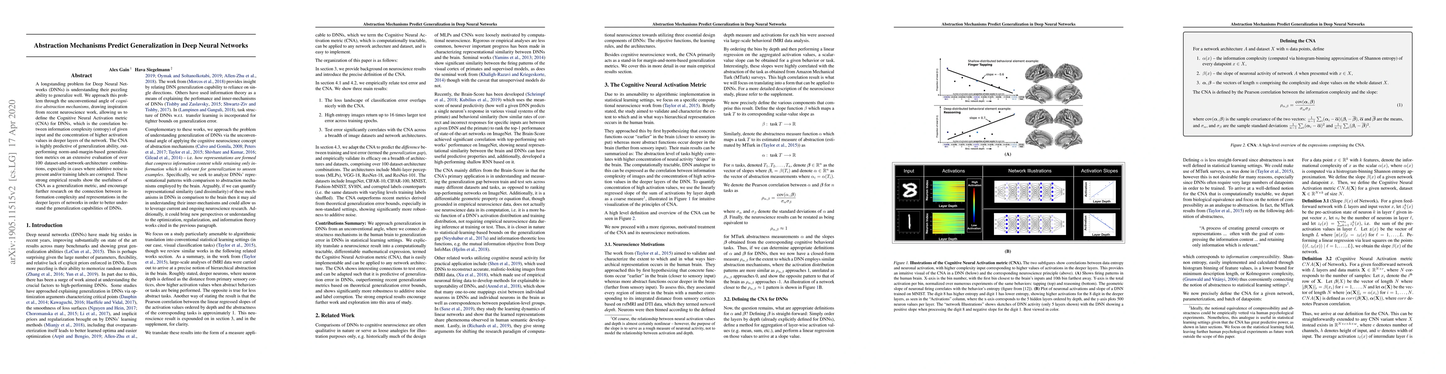 A longstanding problem for Deep Neural Networks (DNNs) is understanding their puzzling ability to generalize well. We approach this problem through the unconventional angle of \textit{cognitive abstraction mechanisms}, drawing inspiration from recent neuroscience work, allowing us to define the Cognitive Neural Activation metric (CNA) for DNNs, which is the correlation between information complexity (entropy) of given input and the concentration of higher activation values in deeper layers of the network. The CNA is highly predictive of generalization ability, outperforming norm-and-margin-based generalization metrics on an extensive evaluation of over 100 dataset-and-network-architecture combinations, especially in cases where additive noise is present and/or training labels are corrupted. These strong empirical results show the usefulness of CNA as a generalization metric, and encourage further research on the connection between information complexity and representations in the deeper layers of networks in order to better understand the generalization capabilities of DNNs.