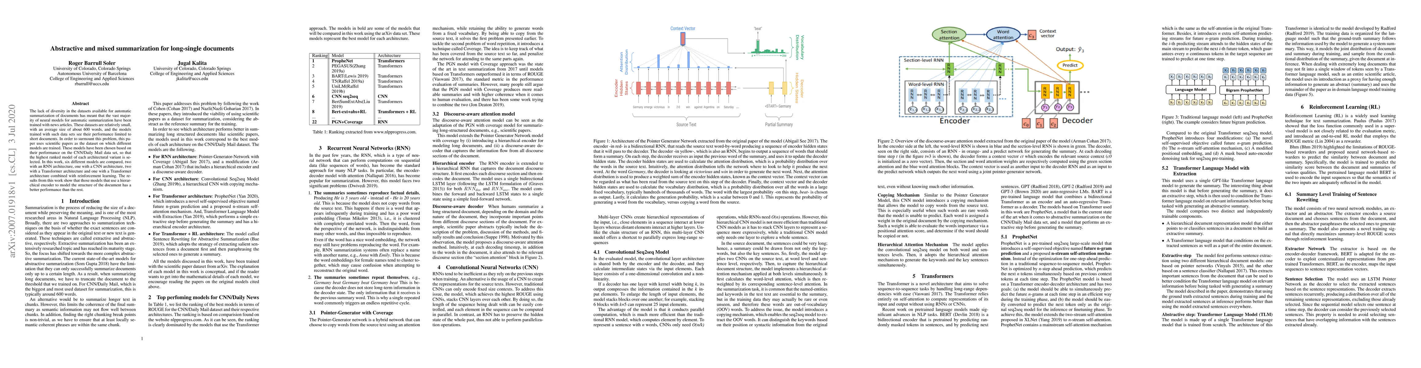 The lack of diversity in the datasets available for automatic summarization of documents has meant that the vast majority of neural models for automatic summarization have been trained with news articles. These datasets are relatively small, with an average size of about 600 words, and the models trained with such data sets see their performance limited to short documents. In order to surmount this problem, this paper uses scientific papers as the dataset on which different models are trained. These models have been chosen based on their performance on the CNN/Daily Mail data set, so that the highest ranked model of each architectural variant is selected. In this work, six different models are compared, two with an RNN architecture, one with a CNN architecture, two with a Transformer architecture and one with a Transformer architecture combined with reinforcement learning. The results from this work show that those models that use a hierarchical encoder to model the structure of the document has a better performance than the rest.