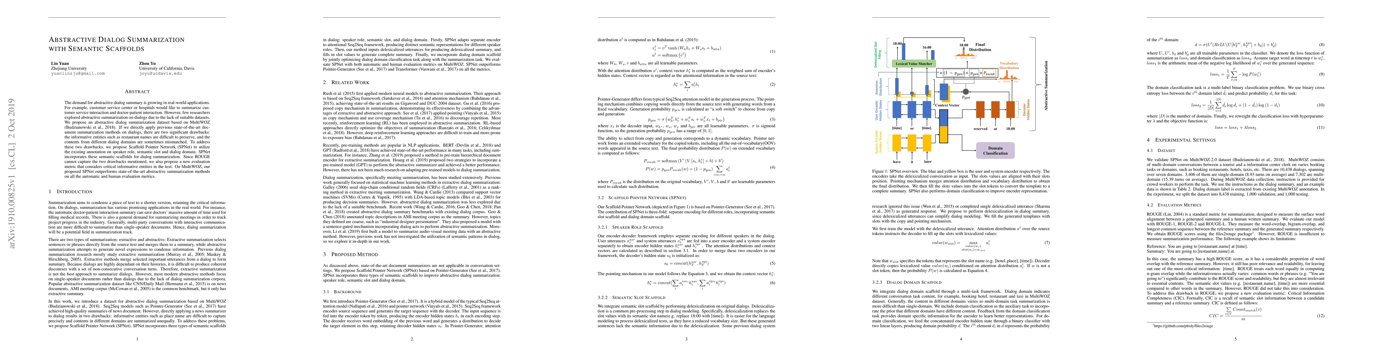 This paper proposes an abstractive dialog summarization dataset based on MultiWOZ and introduces the Scaffold Pointer Network (SPNet) to address challenges in preserving informative entities and matching dialog domain contents. SPNet utilizes semantic scaffolds and a new evaluation metric that considers critical entities, outperforming existing methods on automatic and human evaluations.