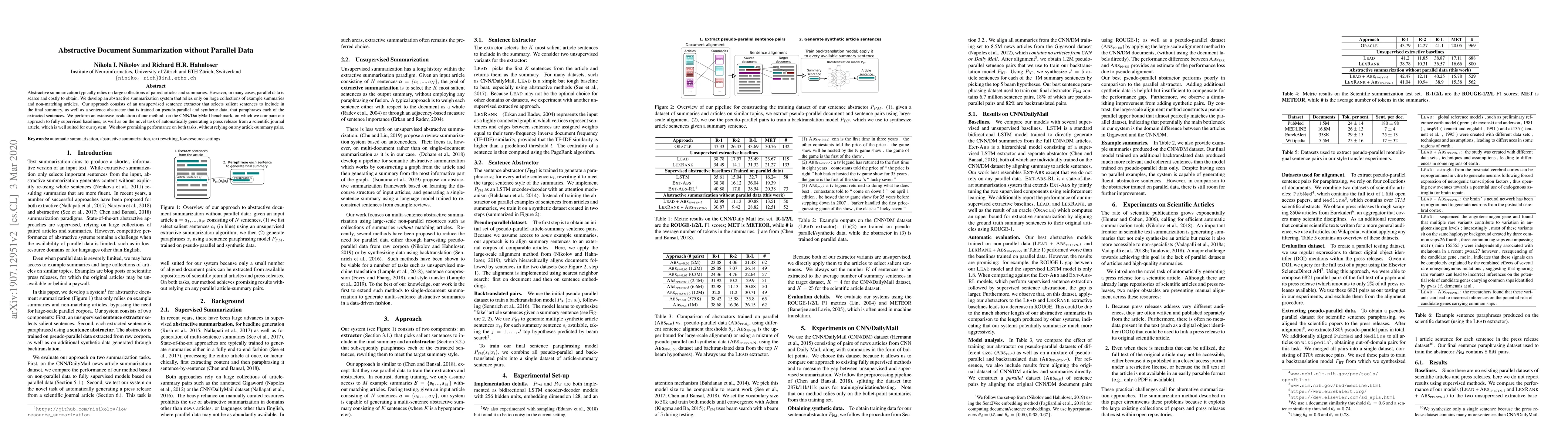 Abstractive summarization typically relies on large collections of paired articles and summaries. However, in many cases, parallel data is scarce and costly to obtain. We develop an abstractive summarization system that relies only on large collections of example summaries and non-matching articles. Our approach consists of an unsupervised sentence extractor that selects salient sentences to include in the final summary, as well as a sentence abstractor that is trained on pseudo-parallel and synthetic data, that paraphrases each of the extracted sentences. We perform an extensive evaluation of our method: on the CNN/DailyMail benchmark, on which we compare our approach to fully supervised baselines, as well as on the novel task of automatically generating a press release from a scientific journal article, which is well suited for our system. We show promising performance on both tasks, without relying on any article-summary pairs.