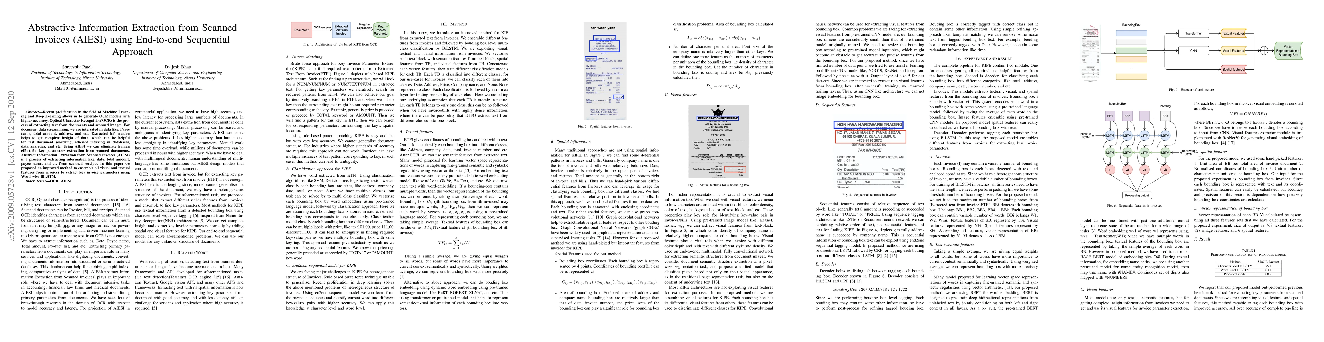 The paper proposes an end-to-end sequential approach, AIESI, for extracting key information from scanned invoices by ensembling visual, textual, and spatial features using BiLSTM. It exploits character and word embeddings, spatial features, and visual features from bounding boxes.