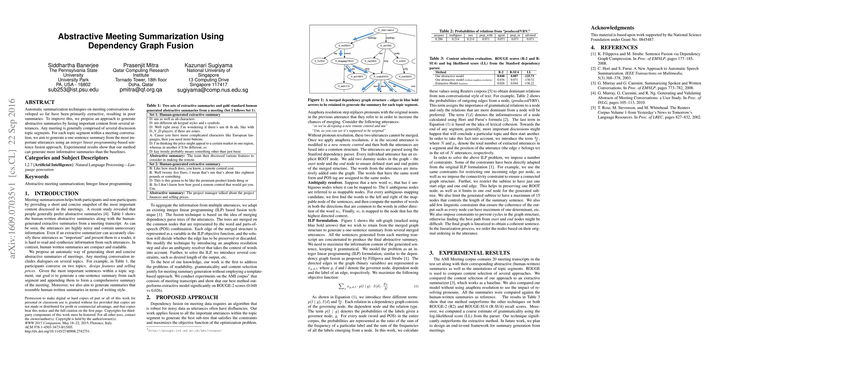 This paper proposes an abstractive summarization method for meeting conversations by fusing key content from multiple utterances using an integer linear programming-based approach. The method generates one-sentence summaries for each discussion topic, resulting in more informative and coherent summaries compared to extractive baselines.