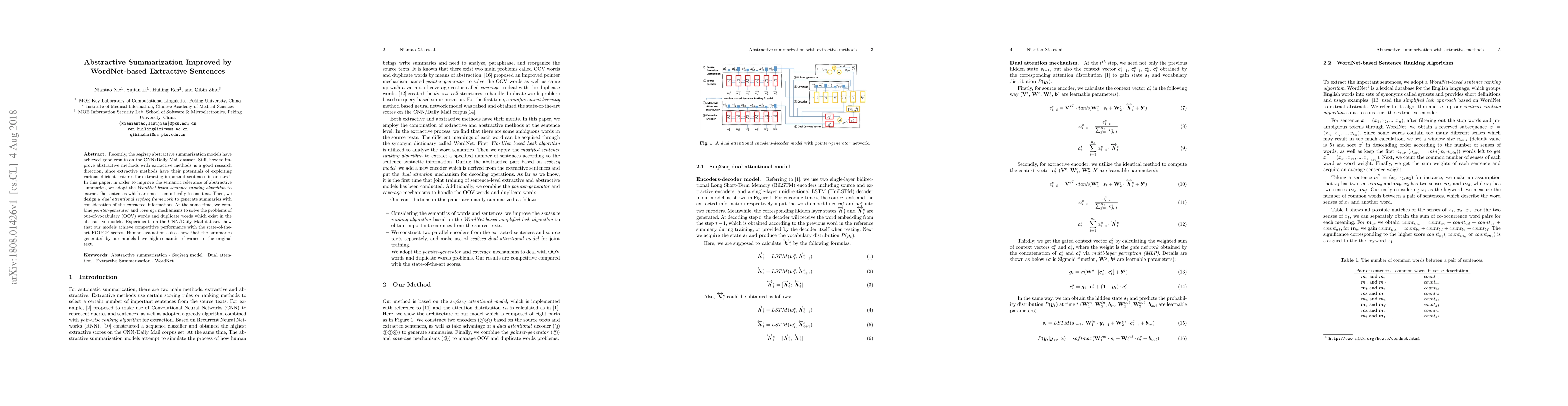 This paper explores enhancing abstractive summarization models by integrating extractive methods using a WordNet-based sentence ranking algorithm. The proposed dual attentional seq2seq framework, combined with pointer-generator and coverage mechanisms, addresses out-of-vocabulary and duplicate word issues, achieving competitive performance on the CNN/Daily Mail dataset.