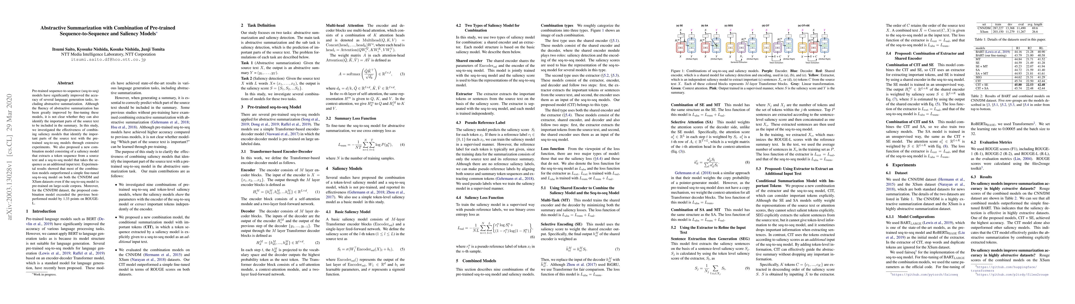 This study combines pre-trained sequence-to-sequence models with saliency models to improve abstractive summarization. Experiments show that the proposed combination model significantly outperforms a fine-tuned seq-to-seq model on CNN/DM and XSum datasets, achieving a 1.33-point ROUGE-L improvement on CNN/DM.