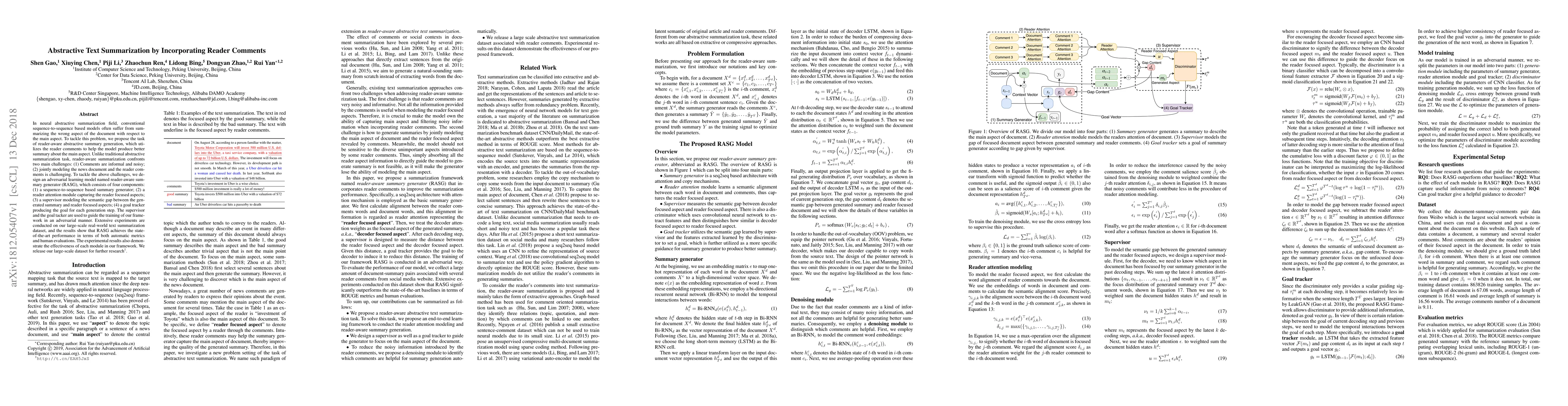 This paper proposes a reader-aware abstractive summarization model, RASG, which uses reader comments to improve summarization focus. RASG addresses challenges of noisy comments and joint modeling through adversarial learning, achieving state-of-the-art performance on a large-scale dataset.