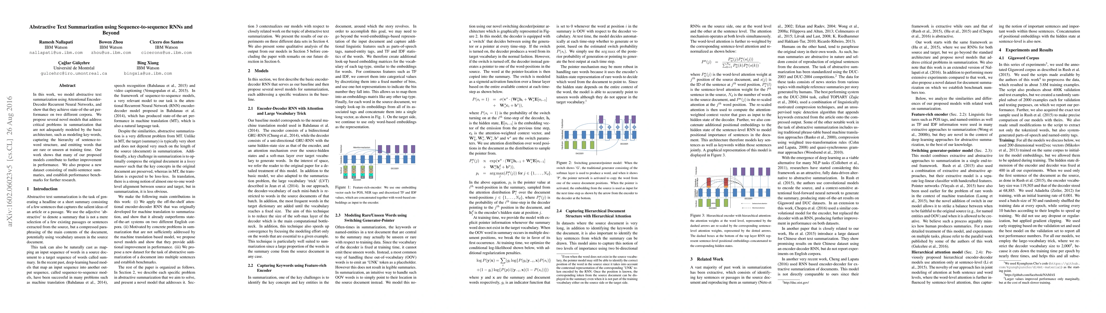 This paper explores abstractive text summarization using advanced Encoder-Decoder RNNs, achieving top performance on two corpora. It introduces novel models to tackle issues like keyword modeling and rare word emission, significantly enhancing summarization quality and establishing new benchmarks with a new multi-sentence summary dataset.