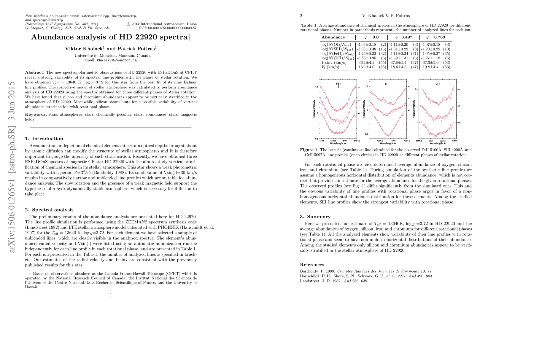 New spectropolarimetric observations of HD 22920 reveal rotational variability in spectral lines, leading to determined Teff and logg. Abundance analysis uncovers stratified silicon and chromium in its atmosphere, with possible phase-dependent silicon stratification variability.
