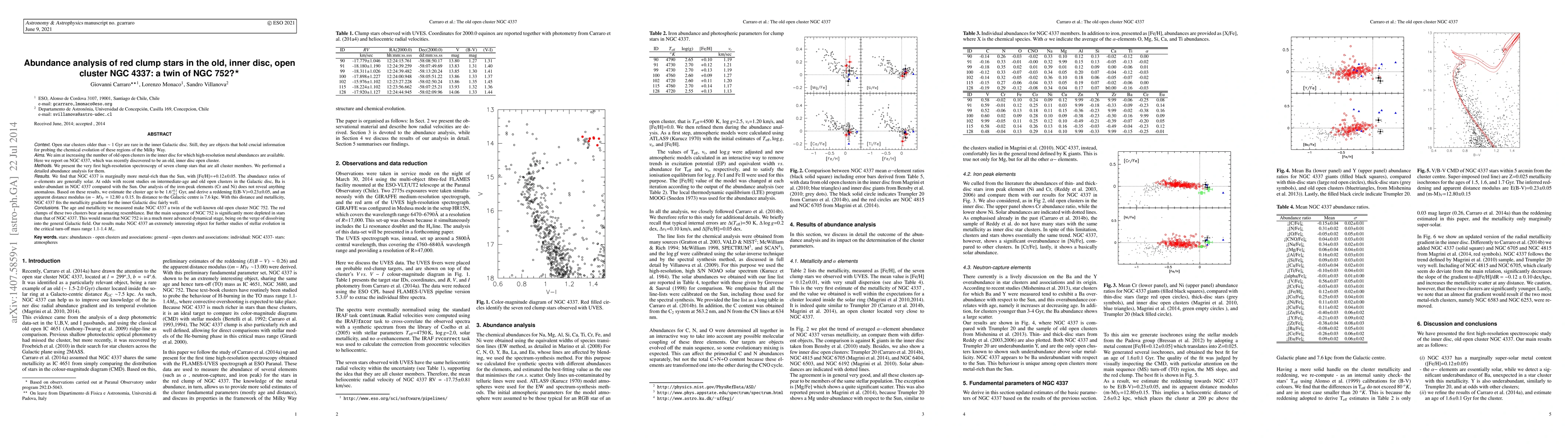 Open star clusters older than ~ 1 Gyr are rare in the inner Galactic disc. Still, they are objects that hold crucial information for probing the chemical evolution of these regions of the Milky Way. We aim at increasing the number of old open clusters in the inner disc for which high-resolution metal abundances are available. Here we report on NGC 4337, which was recently discovered to be an old, inner disc open cluster. We present the very first high-resolution spectroscopy of seven clump stars that are all cluster members. We performed a detailed abundance analysis for them. We find that NGC 4337 is marginally more metal-rich than the Sun, with [Fe/H]=+0.12$\pm$0.05. The abundance ratios of $\alpha$-elements are generally solar. At odds with recent studies on intermediate-age and old open clusters in the Galactic disc, Ba is under-abundant in NGC 4337 compared with the Sun. Our analysis of the iron-peak elements (Cr and Ni) does not reveal anything anomalous. Based on these results, we estimate the cluster age to be 1.6$^{+0.1}_{-0.1}$ Gyr, and derive a reddening E(B-V)=0.23$\pm$0.05, and an apparent distance modulus $(m-M)_{V}=12.80\pm0.15$. Its distance to the Galactic centre is 7.6 kpc. With this distance and metallicity, NGC 4337 fits the metallicity gradient for the inner Galactic disc fairly well. The age and metallicity we measured make NGC 4337 a twin of the well-known old open cluster NGC 752. The red clumps of these two clusters bear an amazing resemblance. But the main sequence of NGC 752 is significantly more depleted in stars than that of NGC 4337. This would mean that NGC 752 is in a much more advanced dynamical stage, being on the verge of dissolving into the general Galactic field. Our results make NGC 4337 an extremely interesting object for further studies of stellar evolution in the critical turn-off mass range 1.1-1.4 solar masses.
