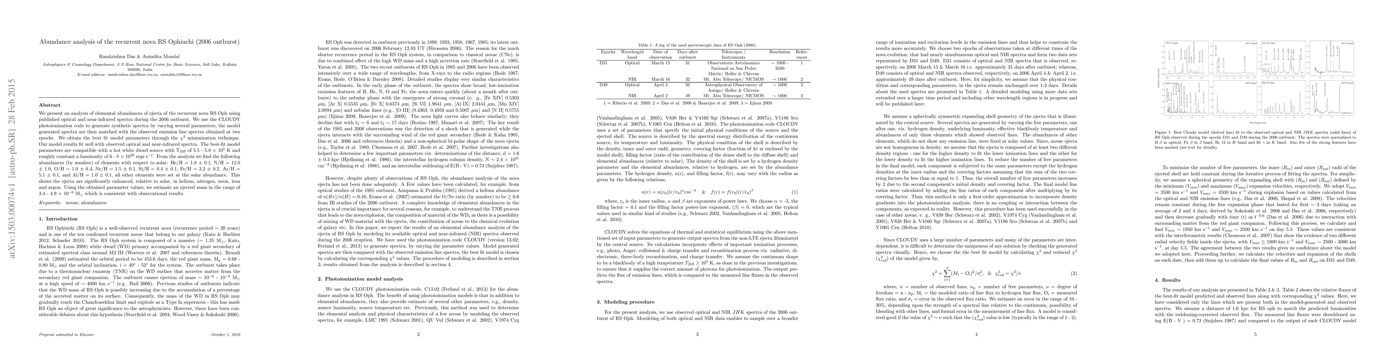 Researchers analyzed the elemental abundances of RS Ophiuchi's 2006 outburst ejecta using synthetic spectra, finding enhanced helium, nitrogen, neon, iron, and argon relative to solar abundance levels.