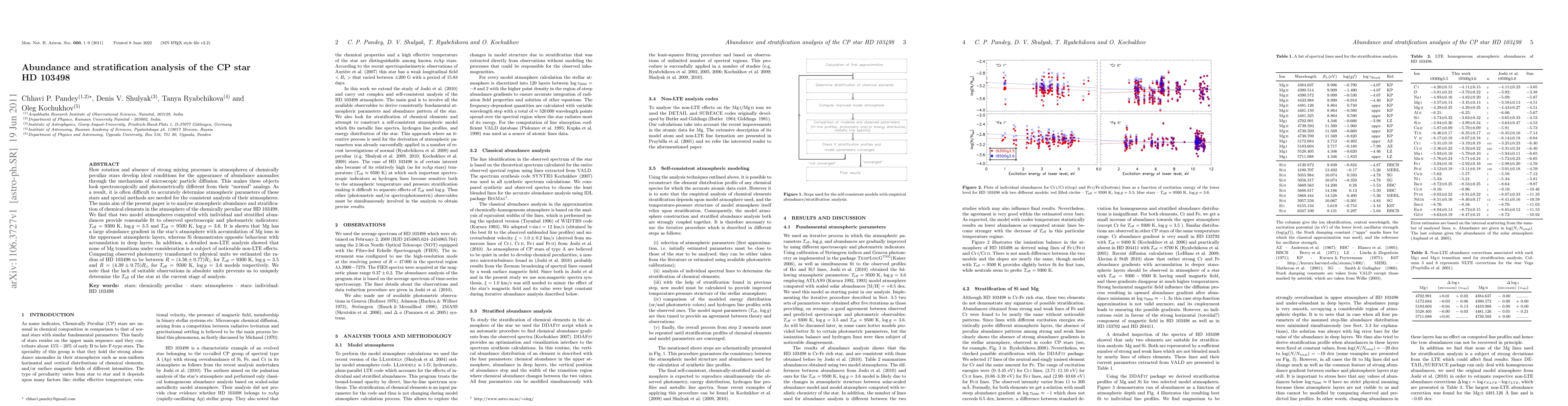 The study analyzes the atmospheric abundance and stratification of chemically peculiar star HD 103498, finding a large magnesium abundance gradient with accumulation in upper layers, while silicon accumulates in deeper layers.