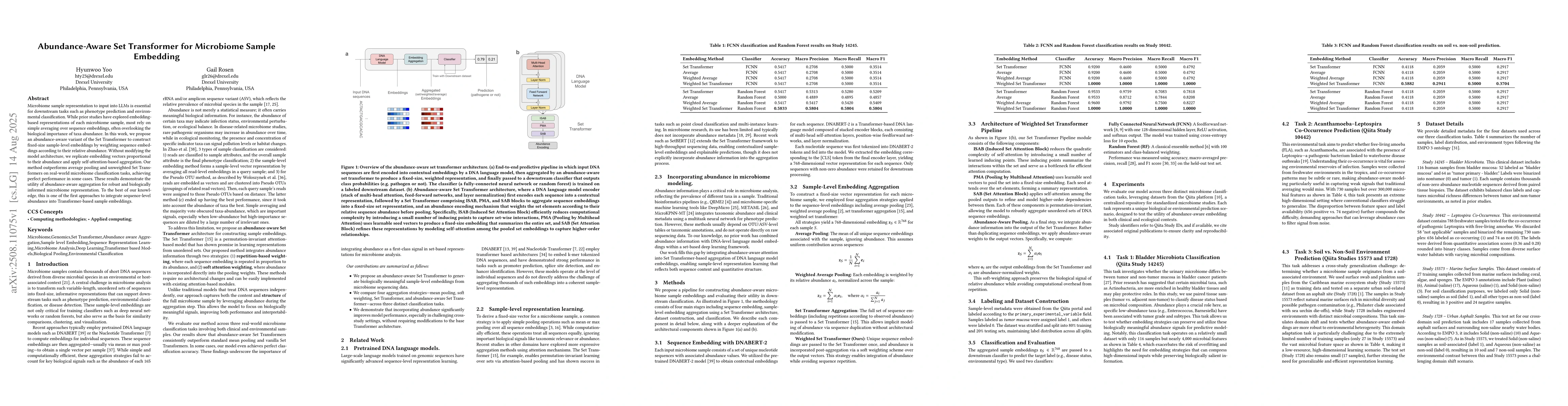 Microbiome sample representation to input into LLMs is essential for downstream tasks such as phenotype prediction and environmental classification. While prior studies have explored embedding-based representations of each microbiome sample, most rely on simple averaging over sequence embeddings, often overlooking the biological importance of taxa abundance. In this work, we propose an abundance-aware variant of the Set Transformer to construct fixed-size sample-level embeddings by weighting sequence embeddings according to their relative abundance. Without modifying the model architecture, we replicate embedding vectors proportional to their abundance and apply self-attention-based aggregation. Our method outperforms average pooling and unweighted Set Transformers on real-world microbiome classification tasks, achieving perfect performance in some cases. These results demonstrate the utility of abundance-aware aggregation for robust and biologically informed microbiome representation. To the best of our knowledge, this is one of the first approaches to integrate sequence-level abundance into Transformer-based sample embeddings.